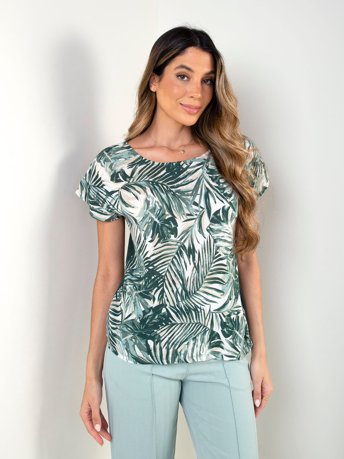 T-shirt verde de manga curta com estampado tropical em destaque. Modelo leve e confortável, ideal para looks descontraídos com um toque fresco e atual. Perfeita para o dia a dia ou para dar mais vida a combinações simples.