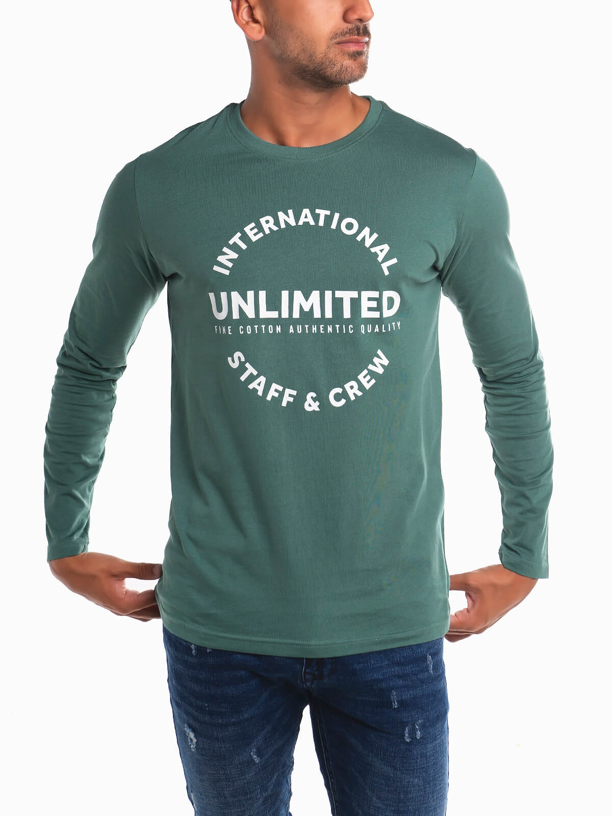 T-shirt verde de manga comprida com estampado de letras em círculo. T-shirt para homem 100% algodão com gola redonda.