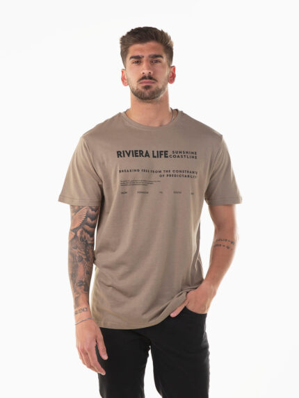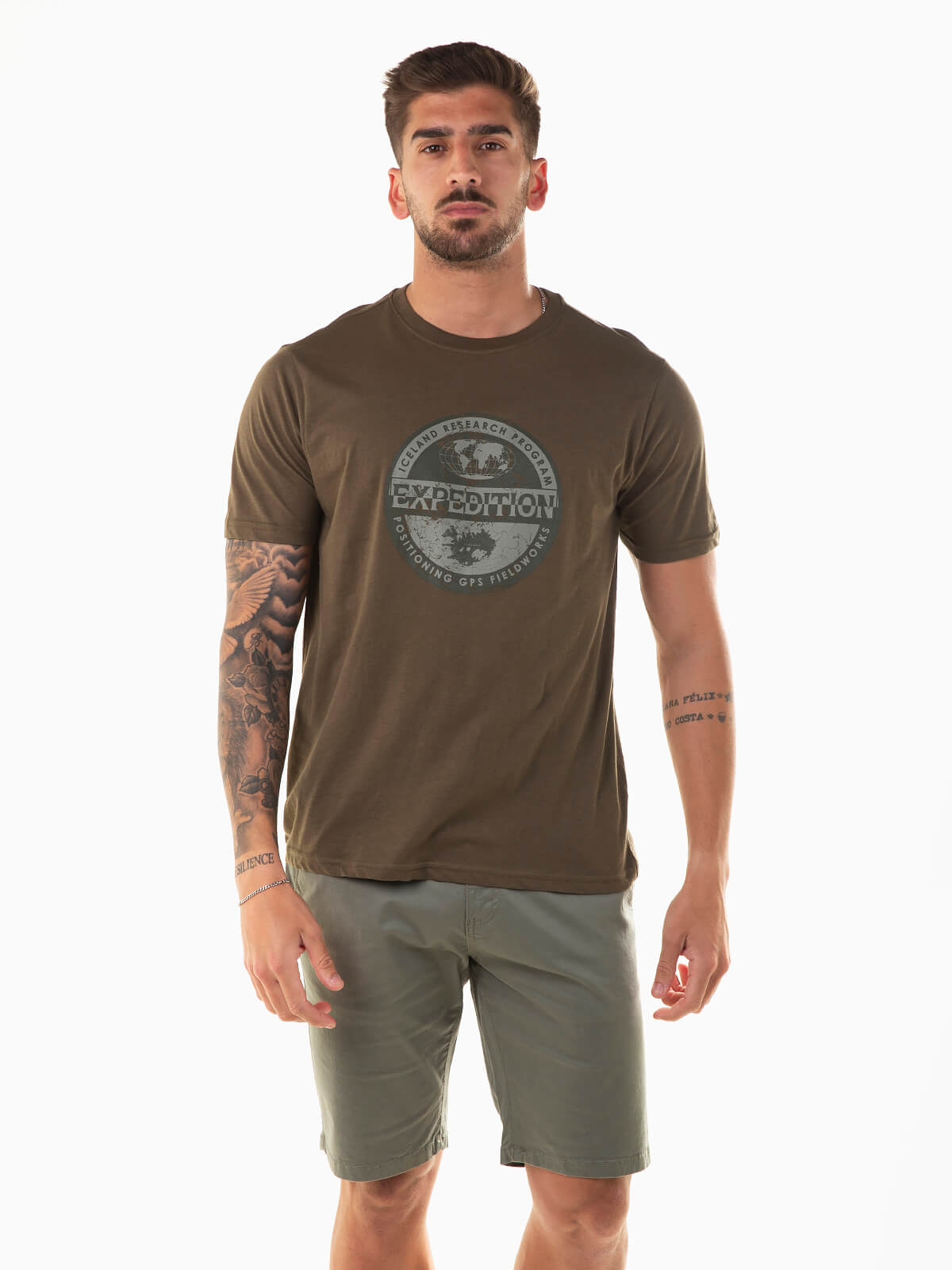 T-shirt verde tropa de manga curta com estampado no peito. T-shirt 100% algodão para homem com gola redonda.