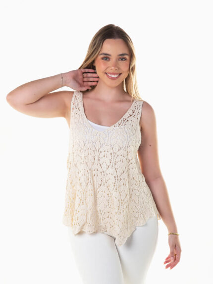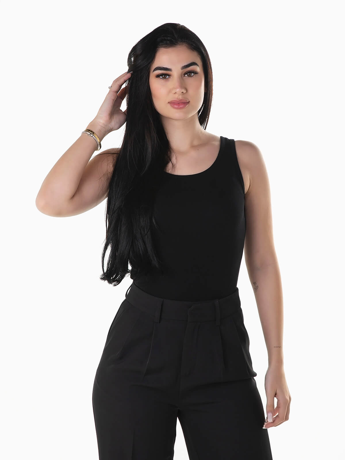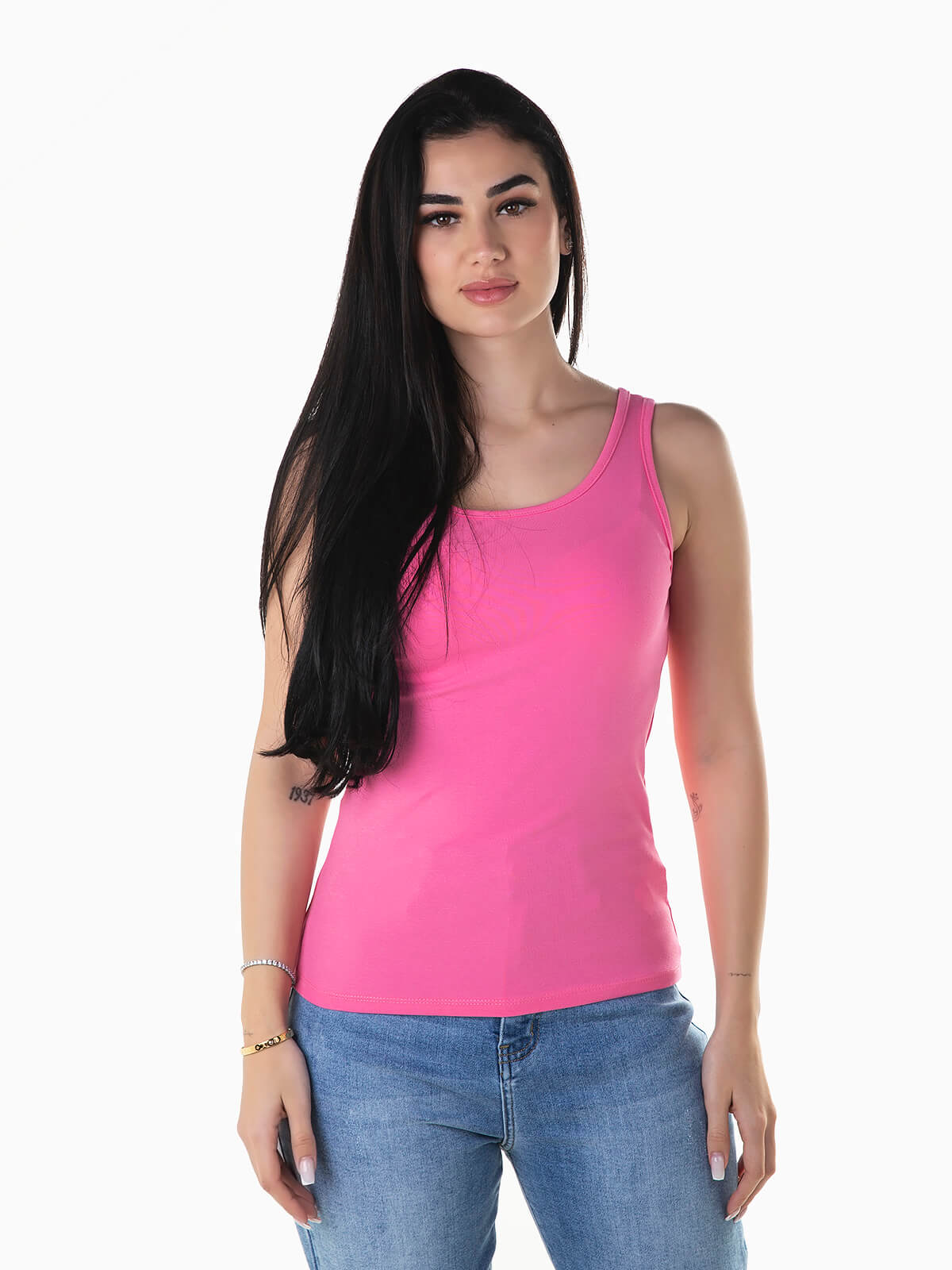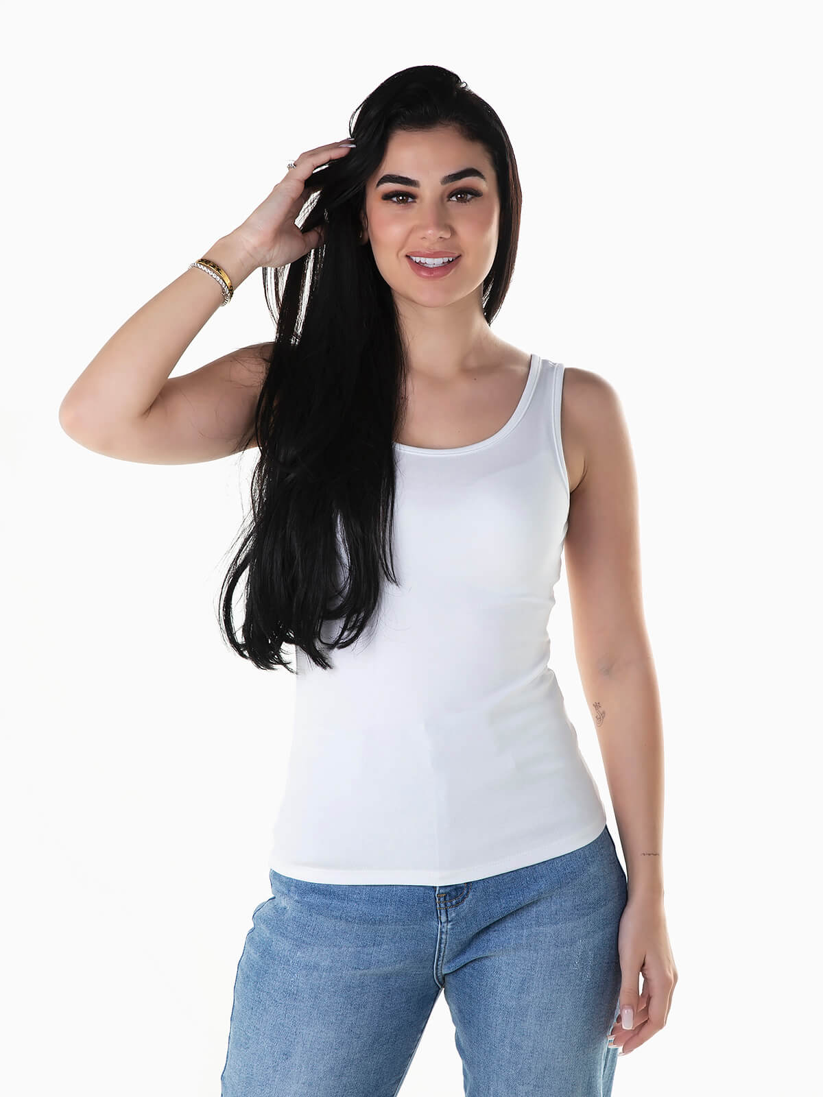 Tank top básico em tecido algodão para maior respirabilidade. Top elástico de manga cava com decote redondo.