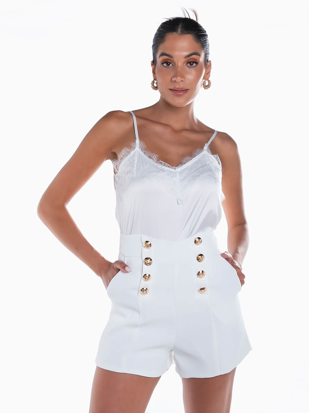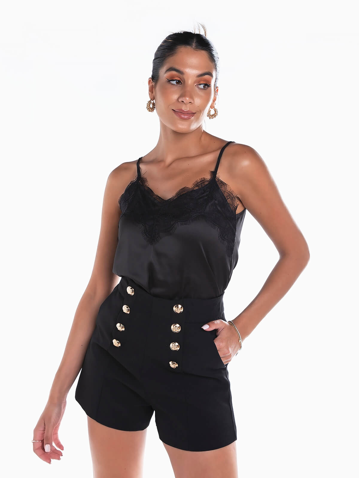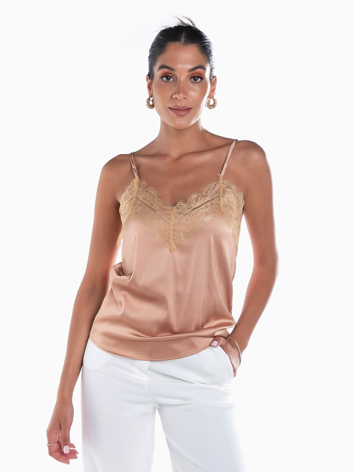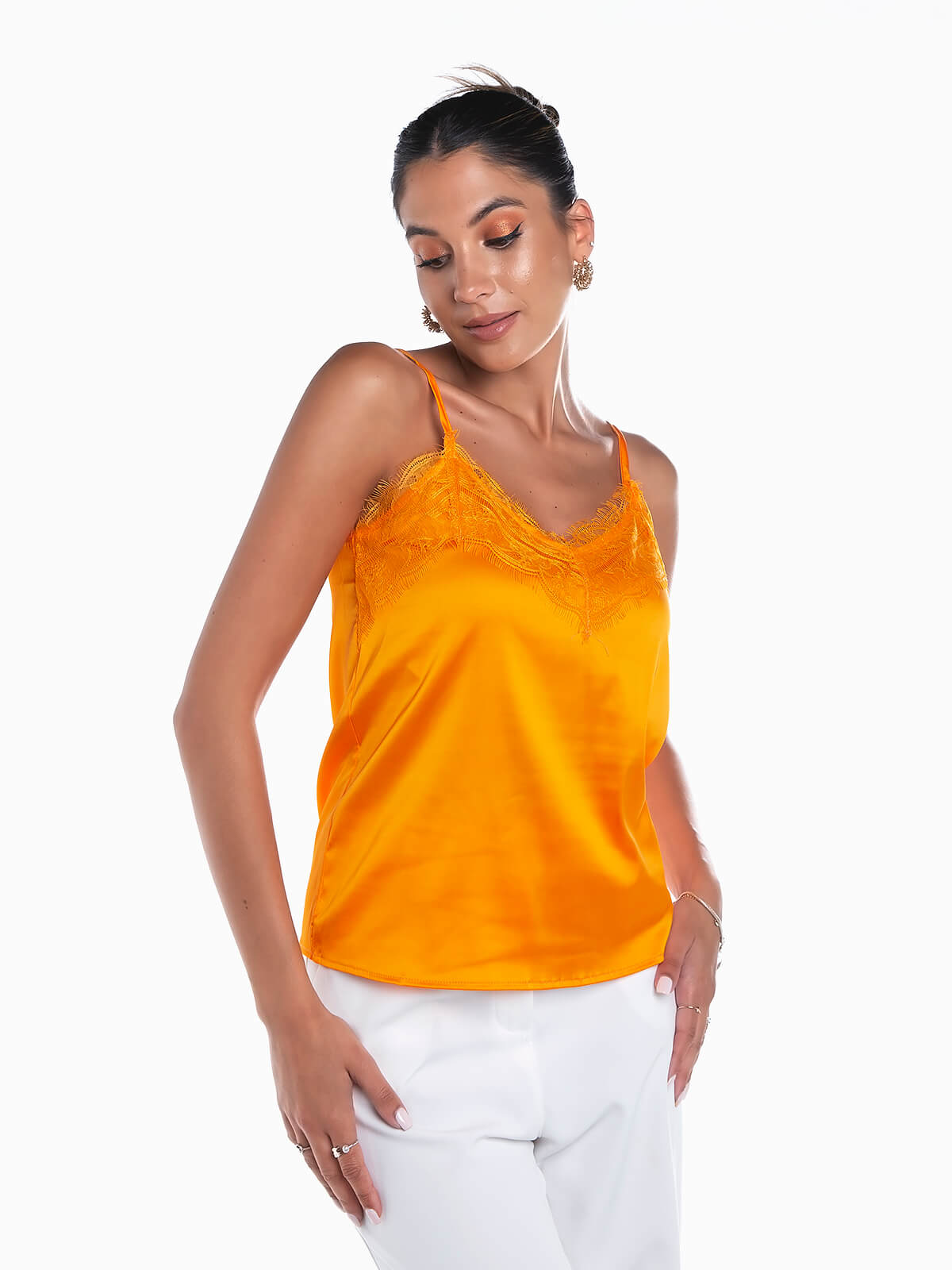 Top acetinada com encaixe de renda para senhora. Top de alças finas reguláveis com decote em bico.
