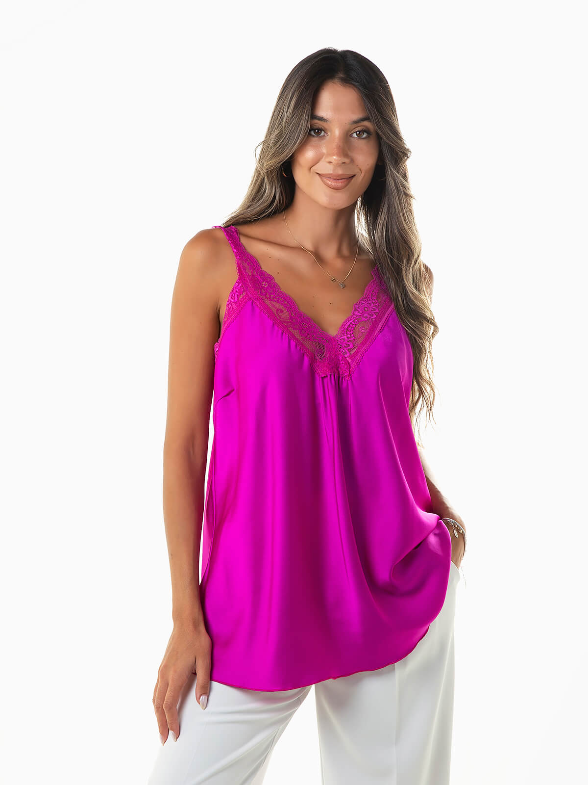 Top acetinado combinado com renda nas extremidades. Top fluído com decote em V.
