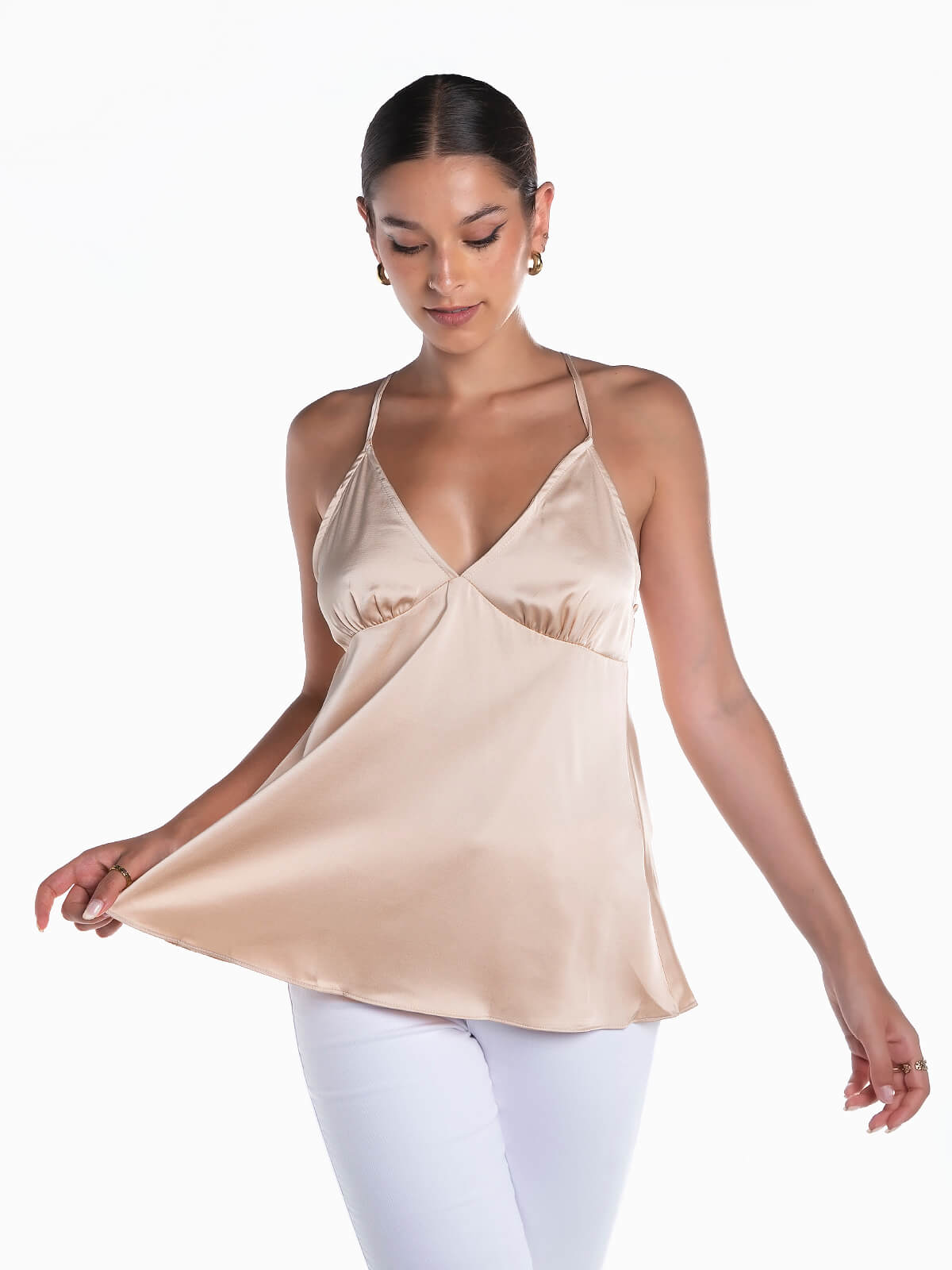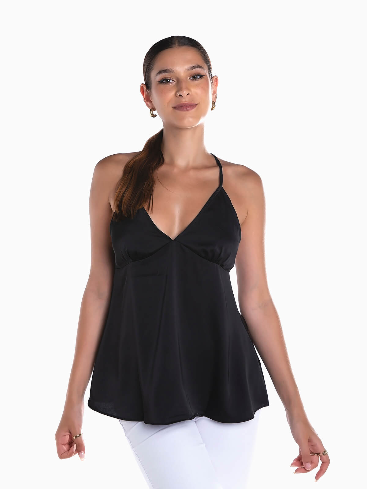 Top acetinada com alças finas cruzadas atrás. Top com costas abertas e decote em bico.
