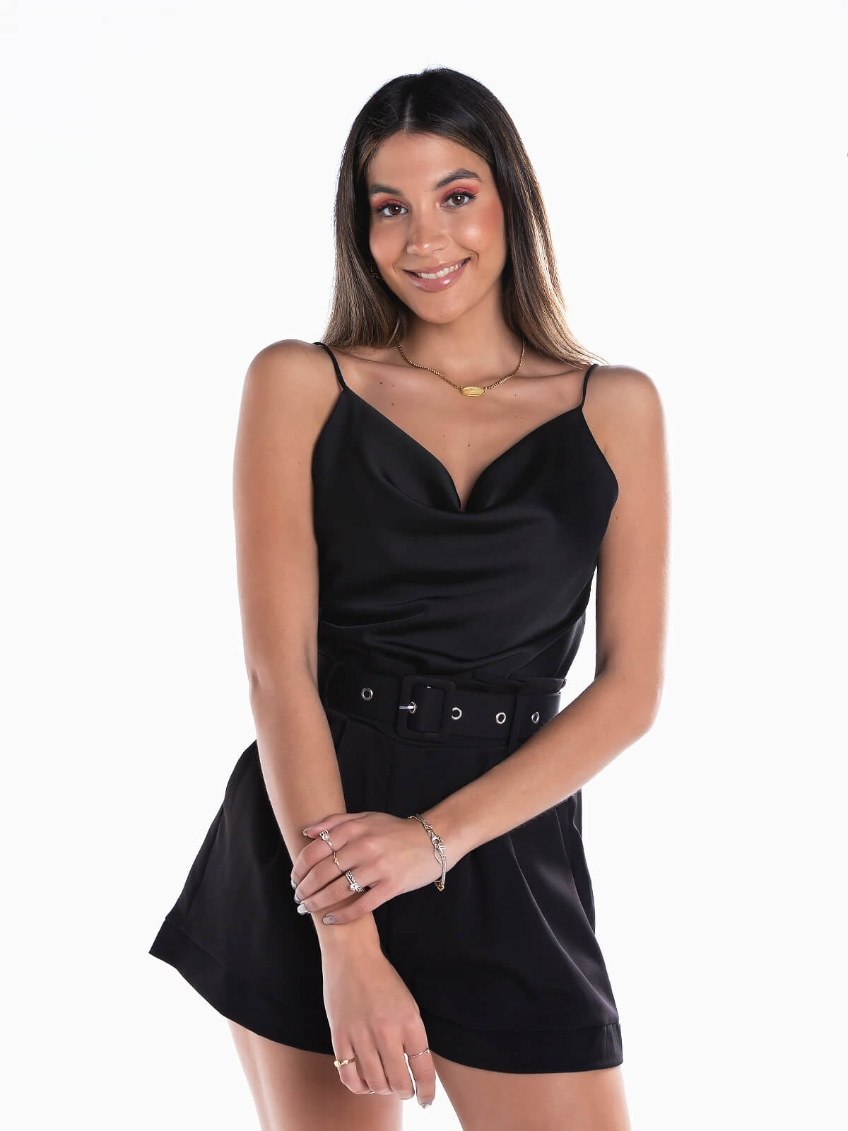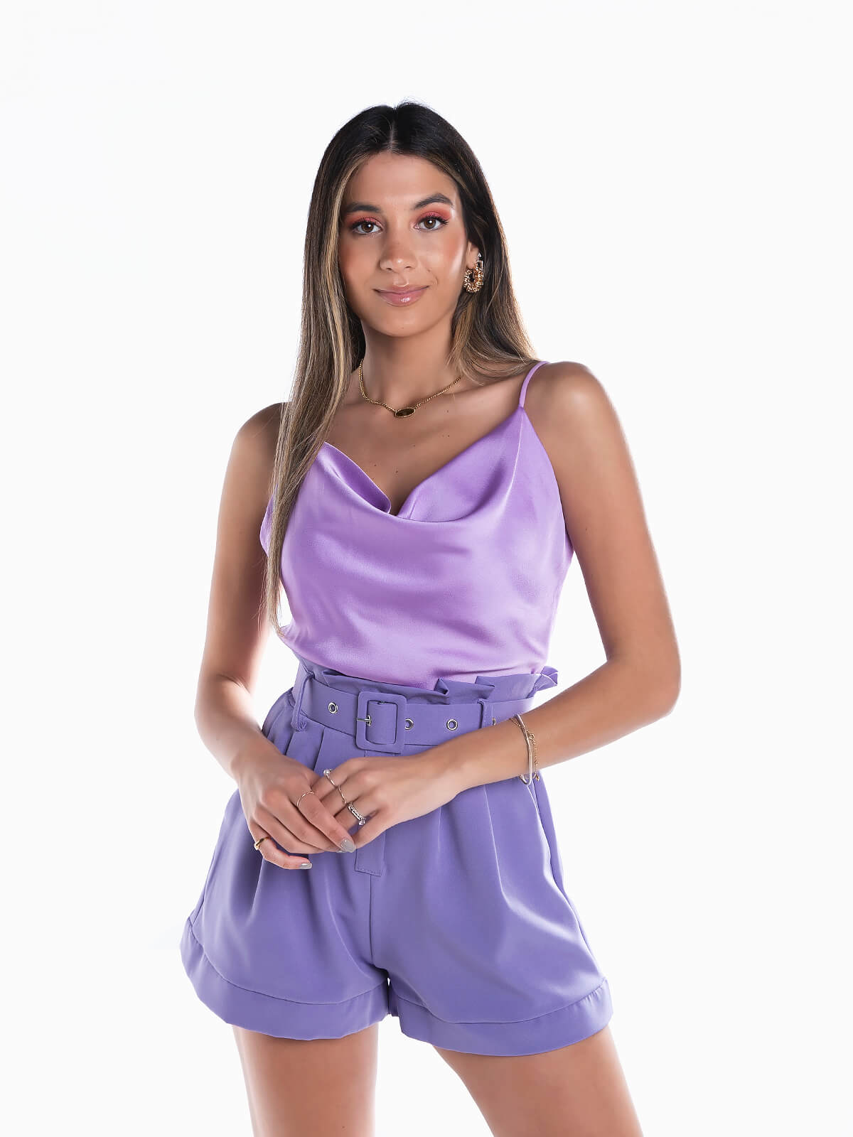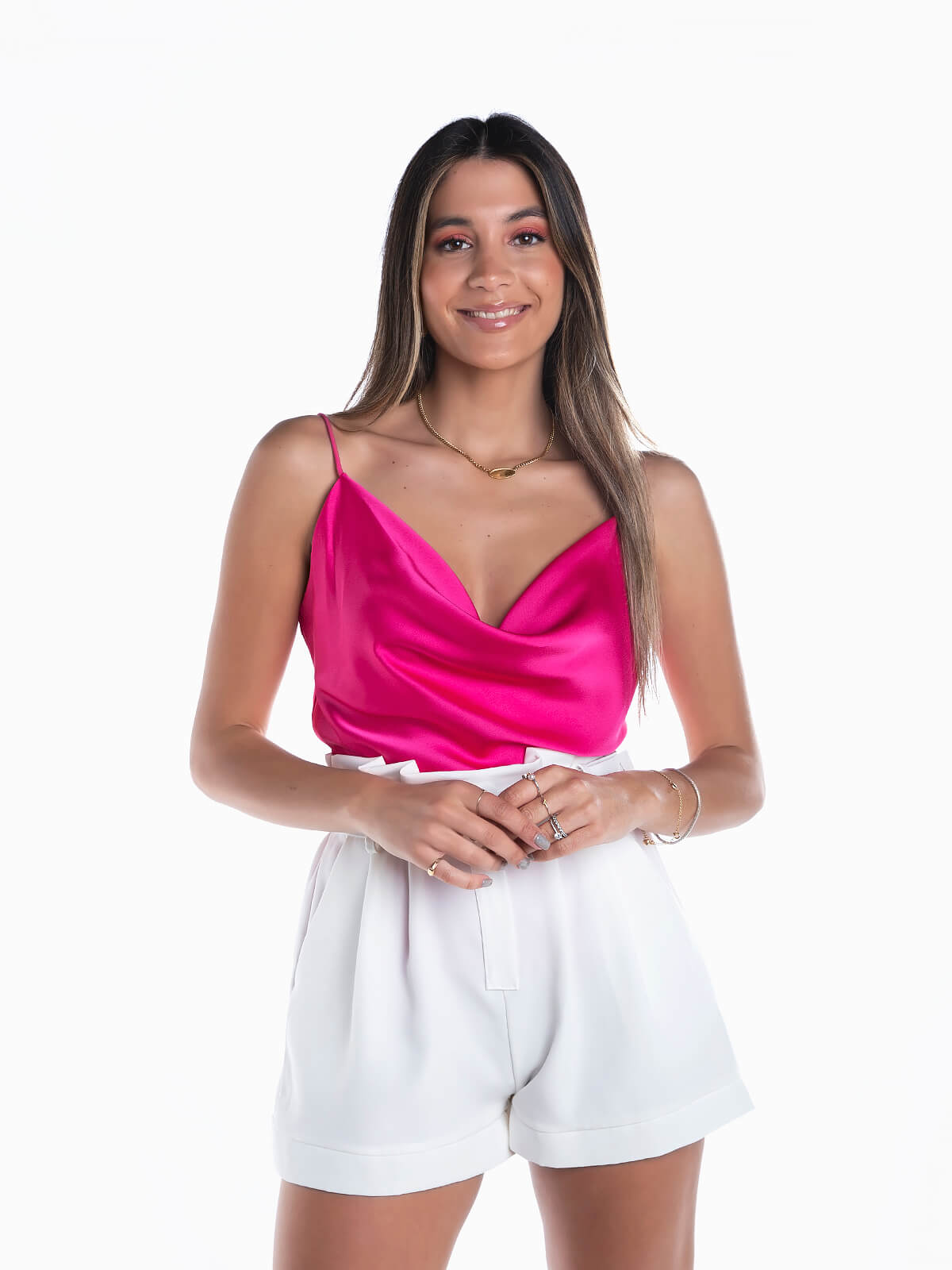 Top de alças acetinado com decote drapeado para senhora. Top em tecido fluído.