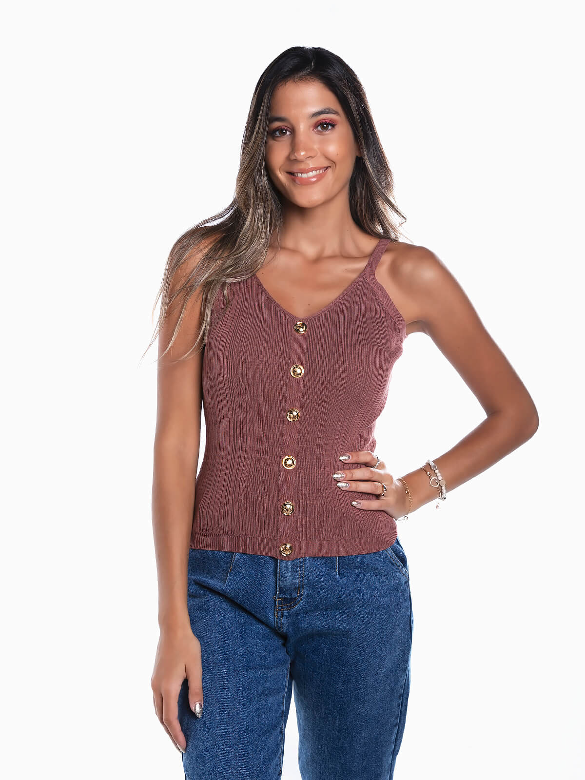 Top de alças canelado com botões dourados decorativos. Top de malha com decote em bico. Acabamentos em nervuras.