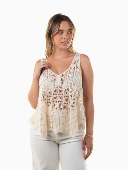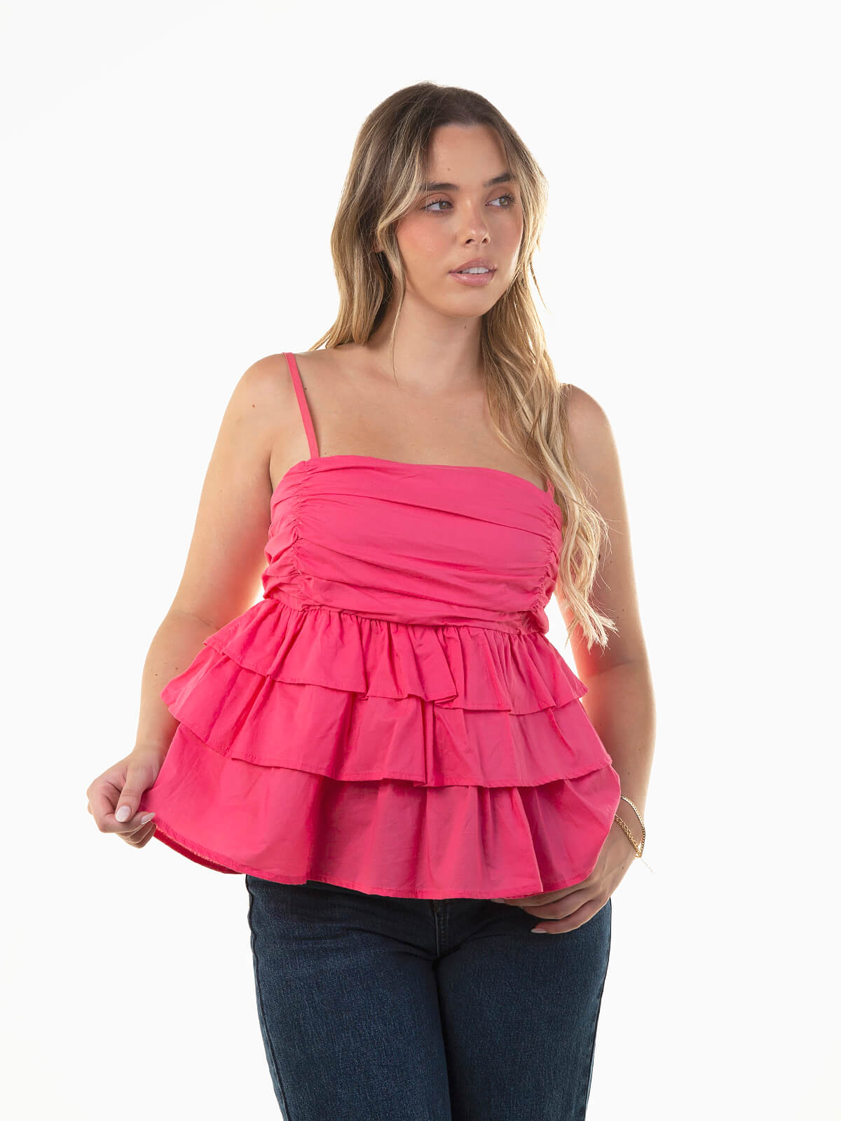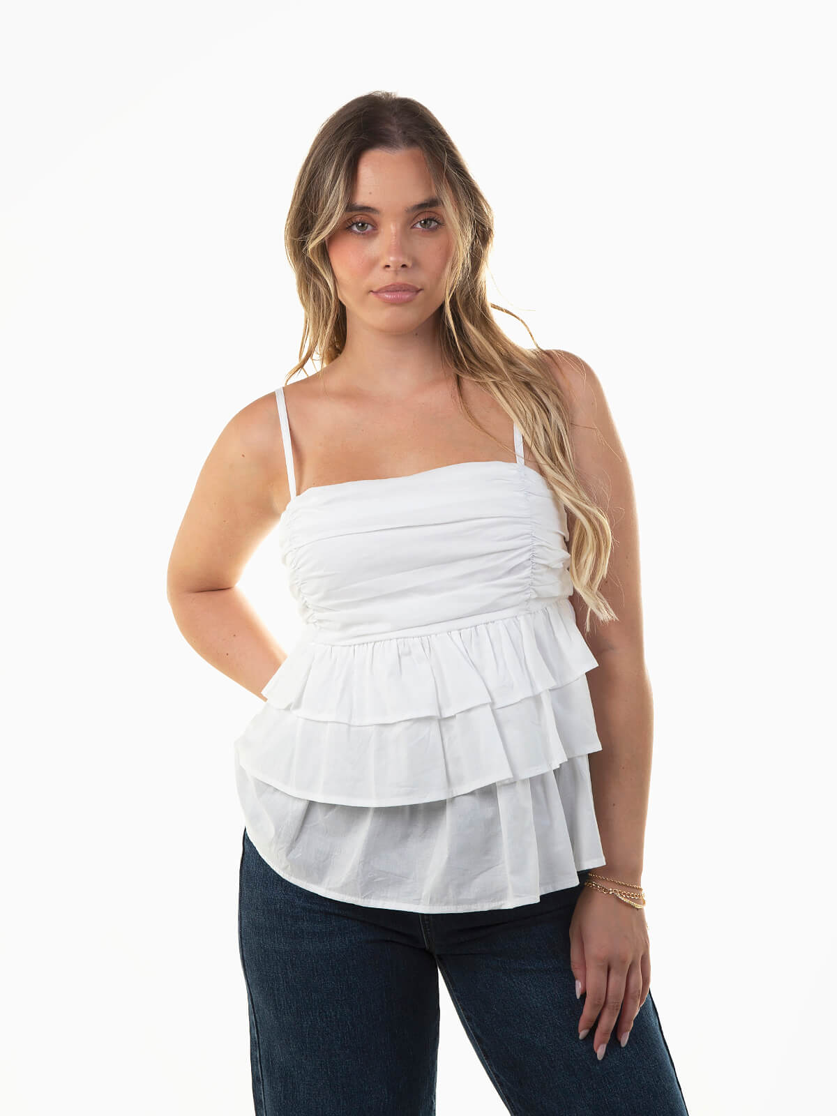 Top em 100% algodão com alças finas e decote quadrado. Modelo com efeito franzido na frente e folhos em camadas, que criam um look leve e feminino. As costas incluem elástico e cordão para um ajuste confortável. Uma peça fresca e versátil para os dias quentes de verão.