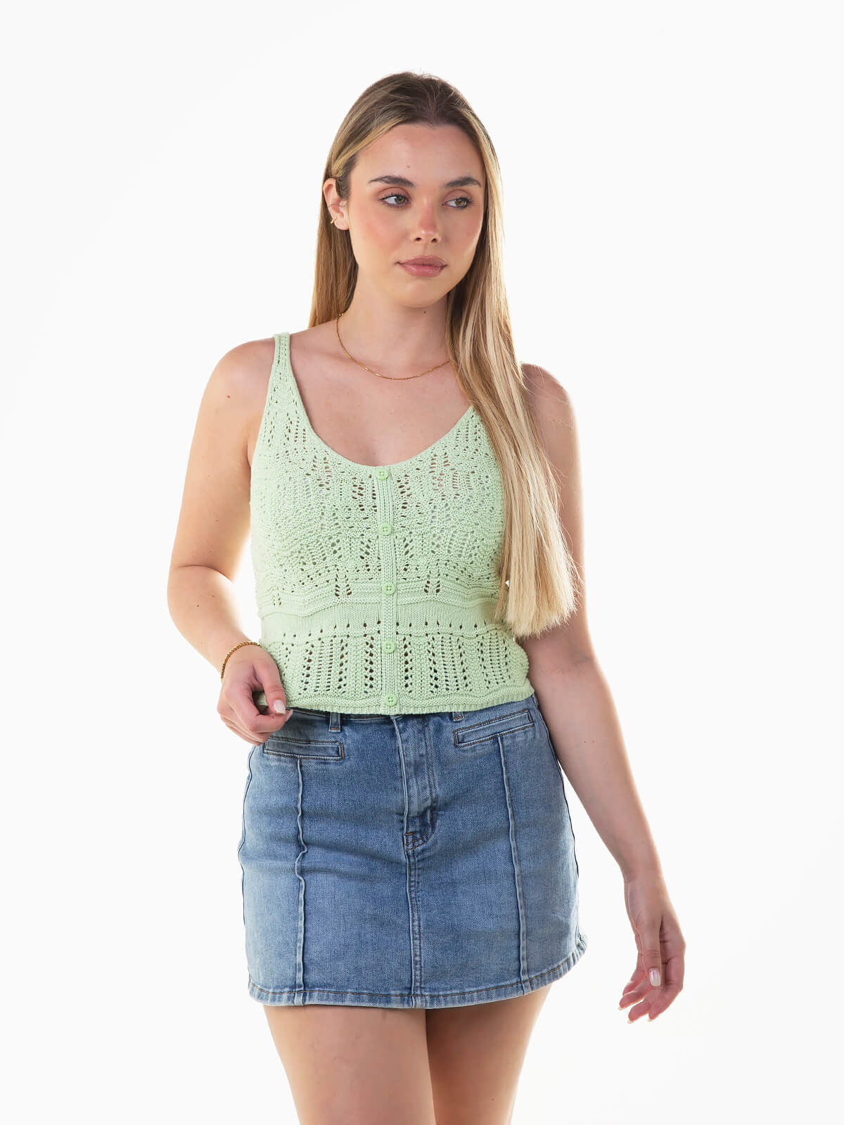Top de alças em crochet 100% algodão para mulher. Top romântico com botões aplicados à frente e decote redondo.