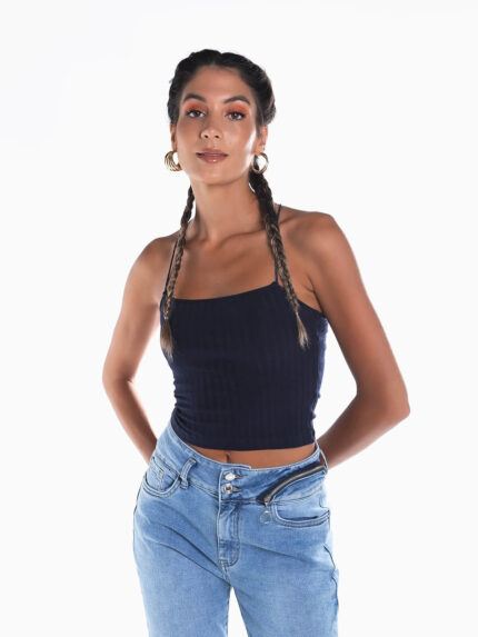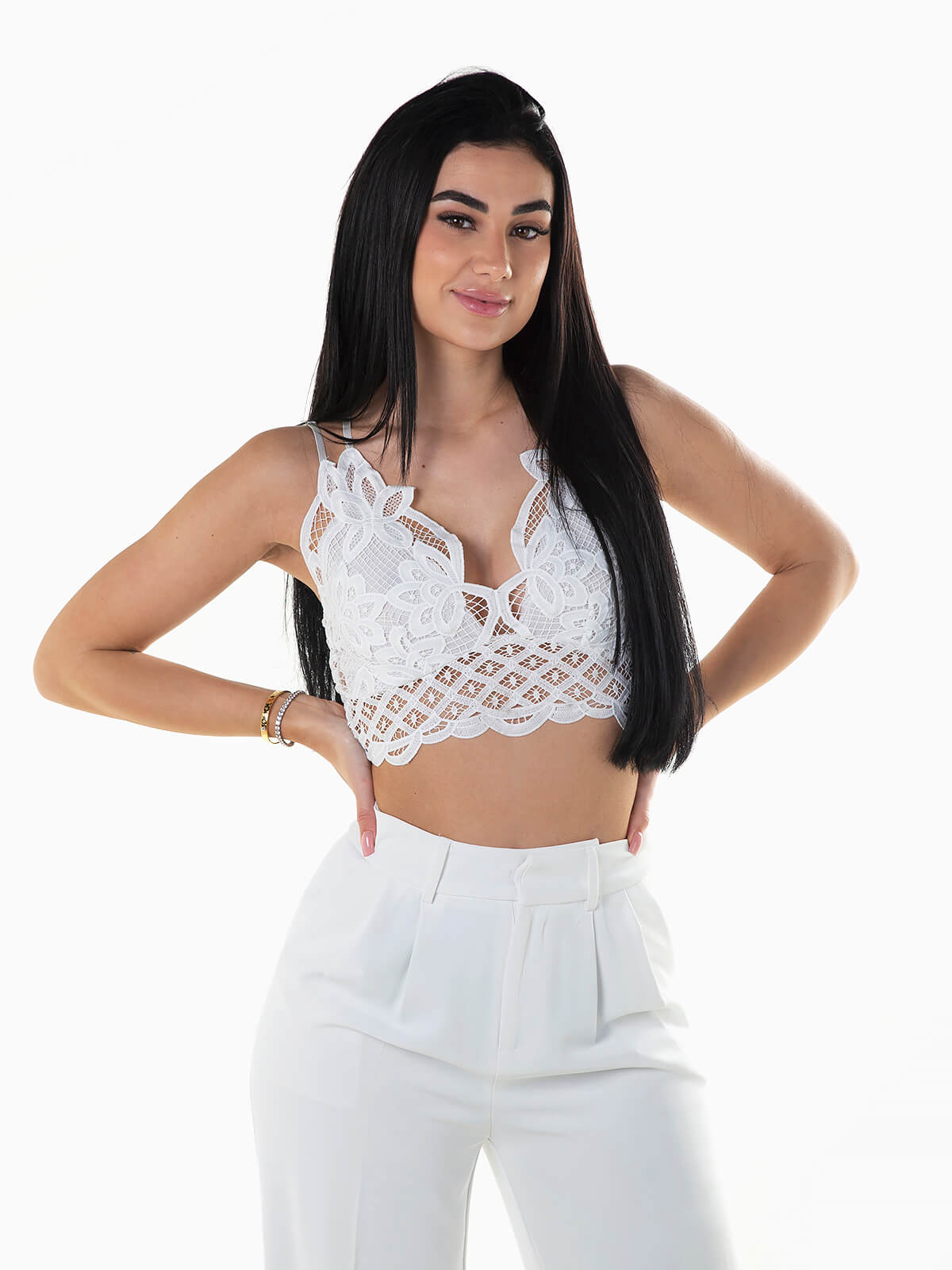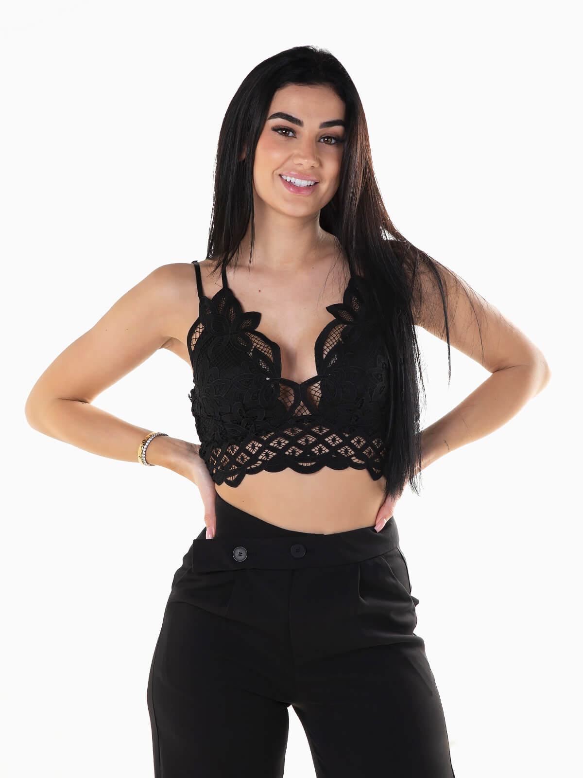 Top curto com alças finas reguláveis e cruzadas atrás. Top bralette com interior forrado. Decote em bico. Parte posterior elástica.