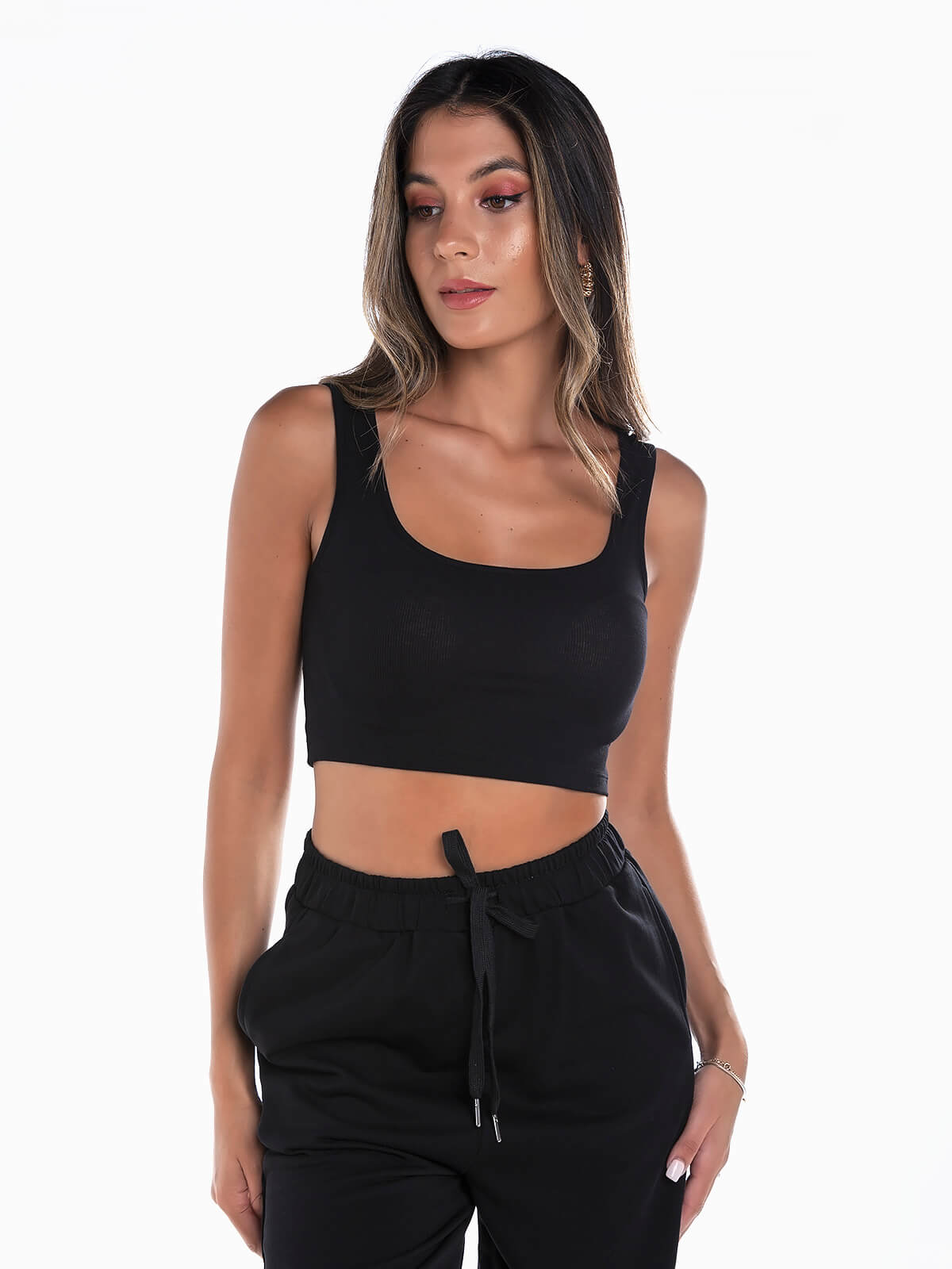 Top de alças curto para senhora. Top em tecido de algodão com decote quadrado.