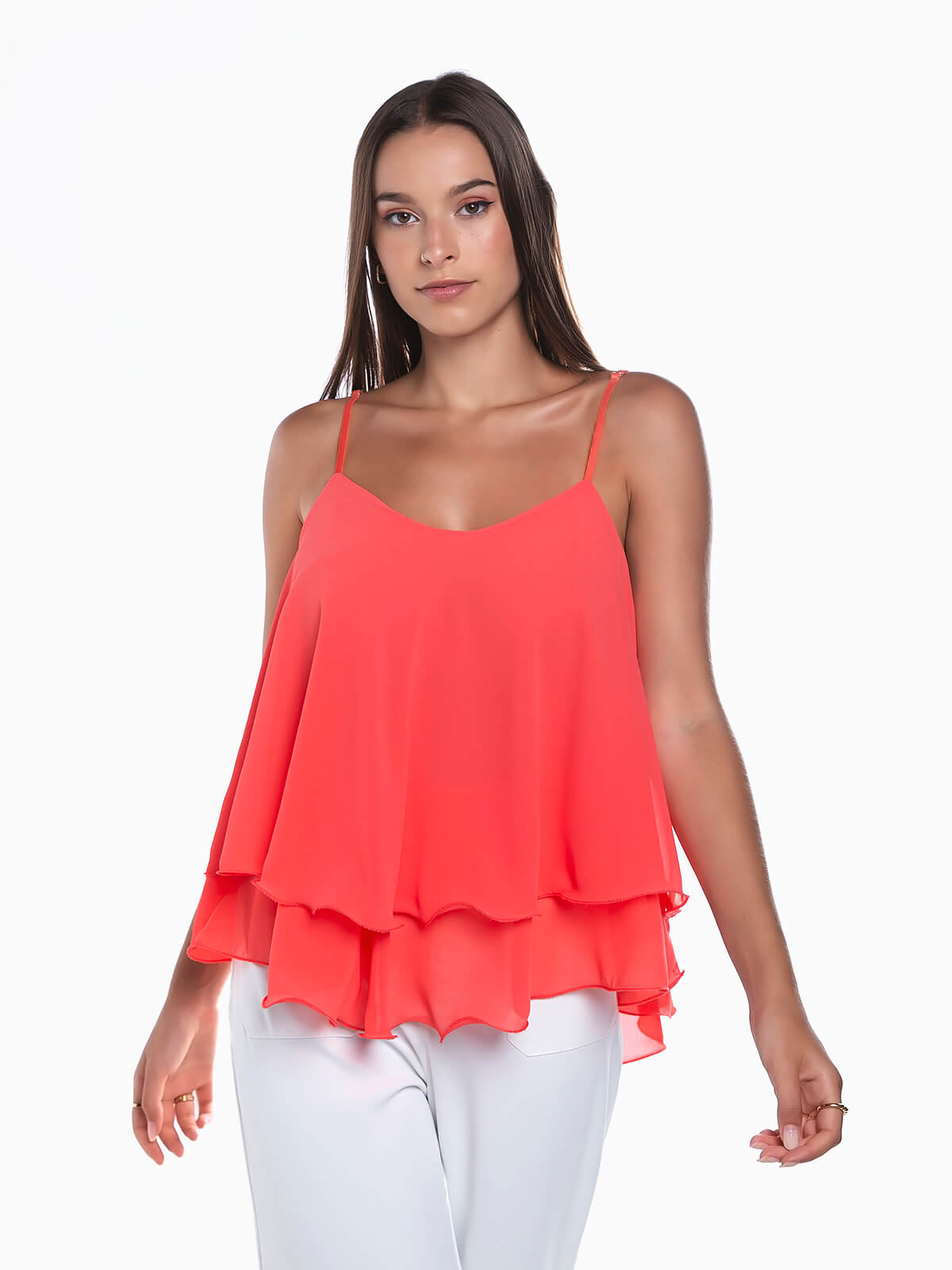 Top de alças finas reguláveis com duplo folho. Top fluído com decote redondo.