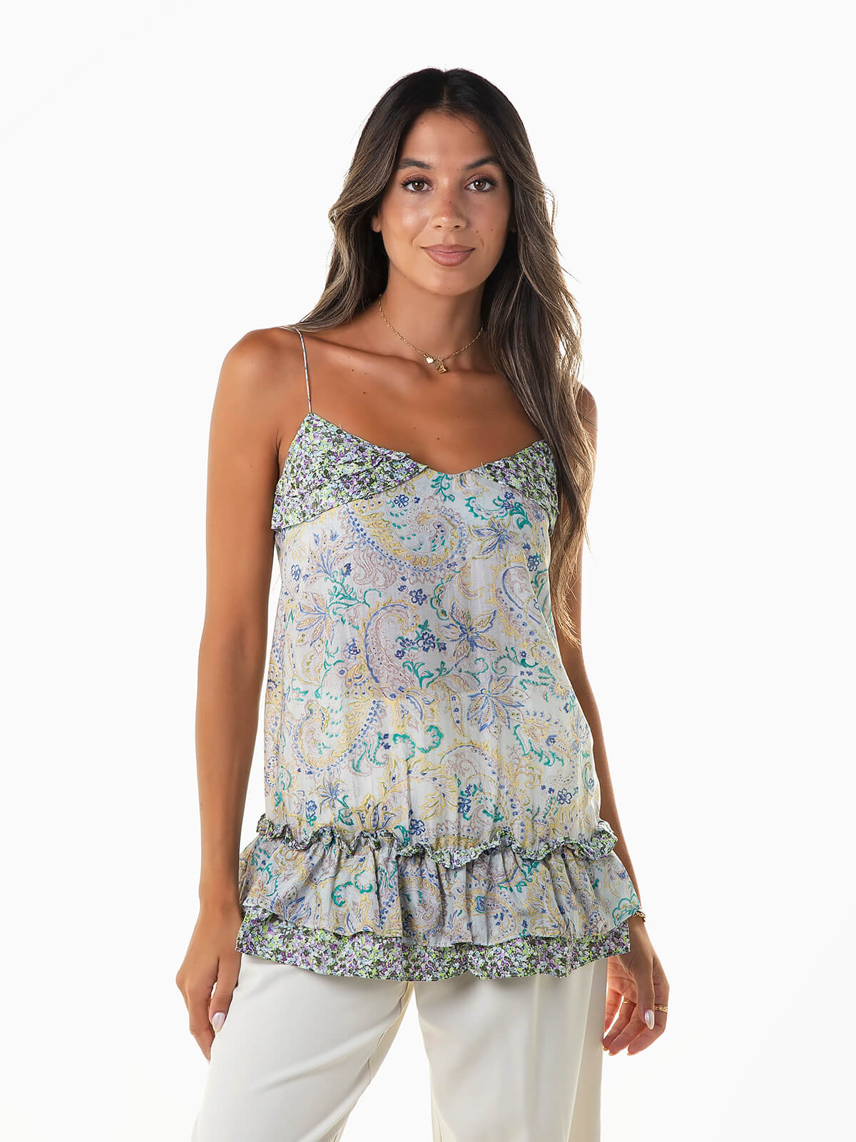 Top de alças finas com estampado floral e pormenor de folhos ao longo do decote e base. Top comprido com decote redondo.