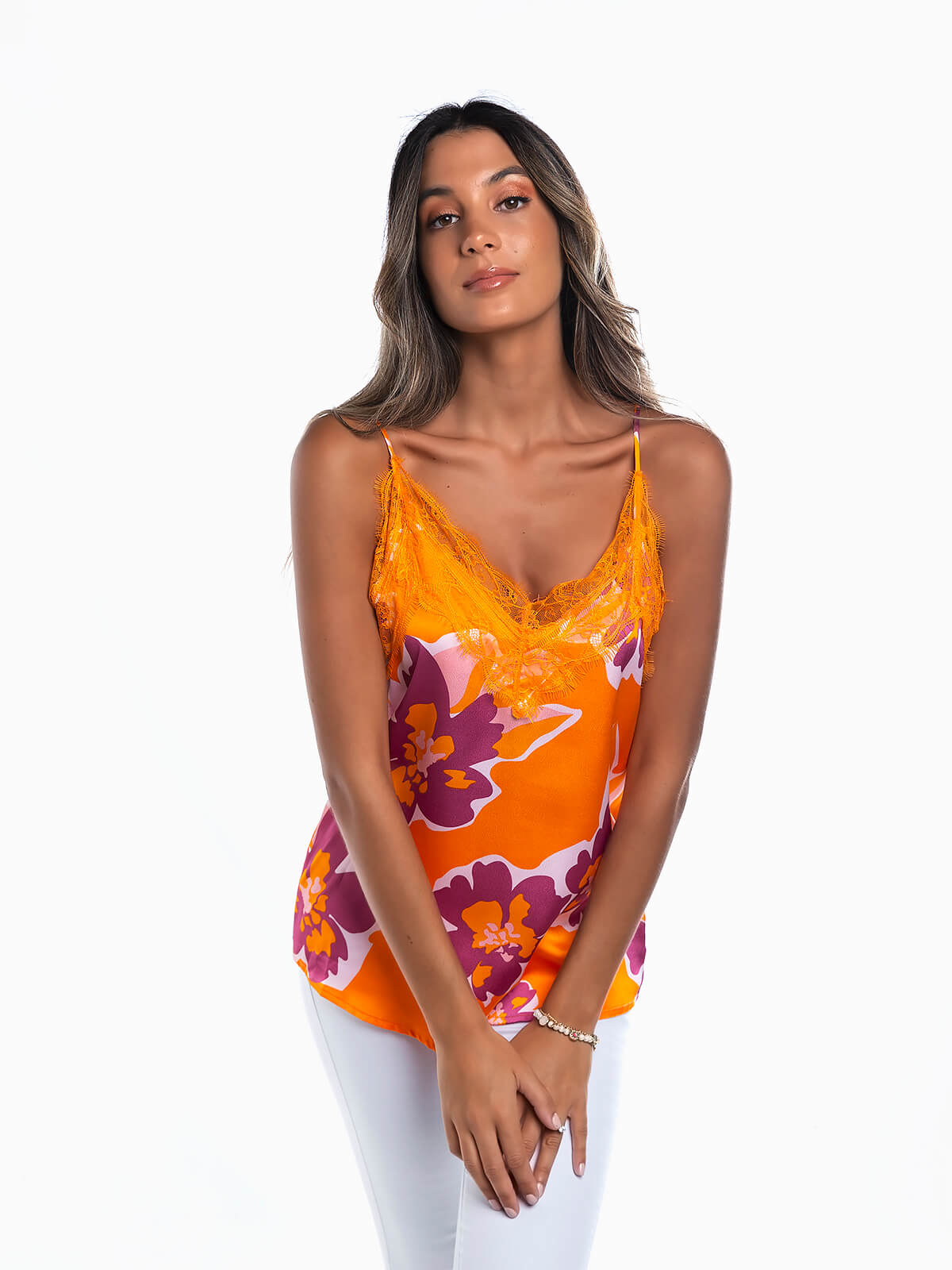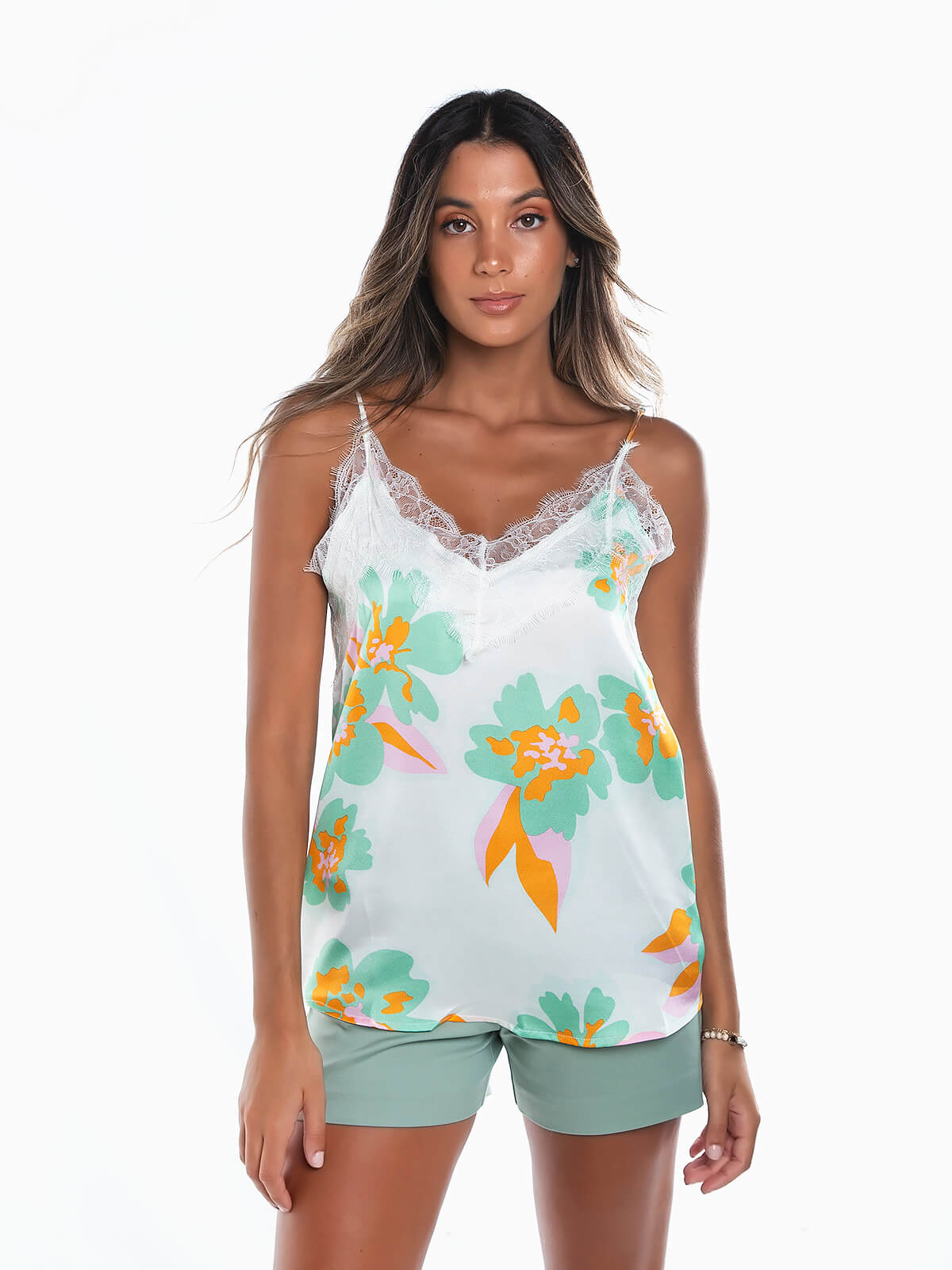 Top estampado floral de alças finas reguláveis com encaixe de renda para senhora. Top com decote em bico.