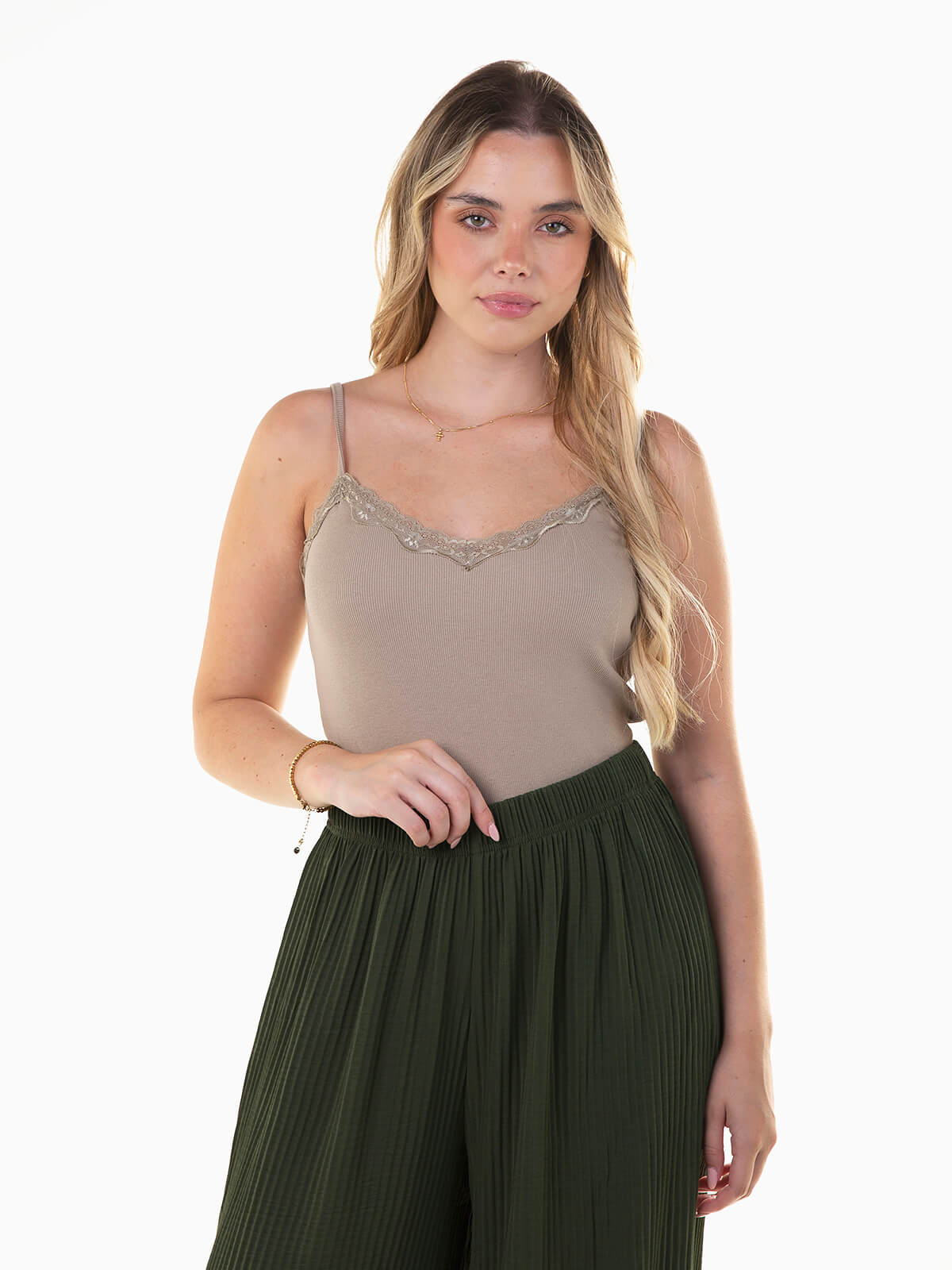 Top de alças em malha canelada para senhora. Top com encaixe de renda ao longo do decote em V.