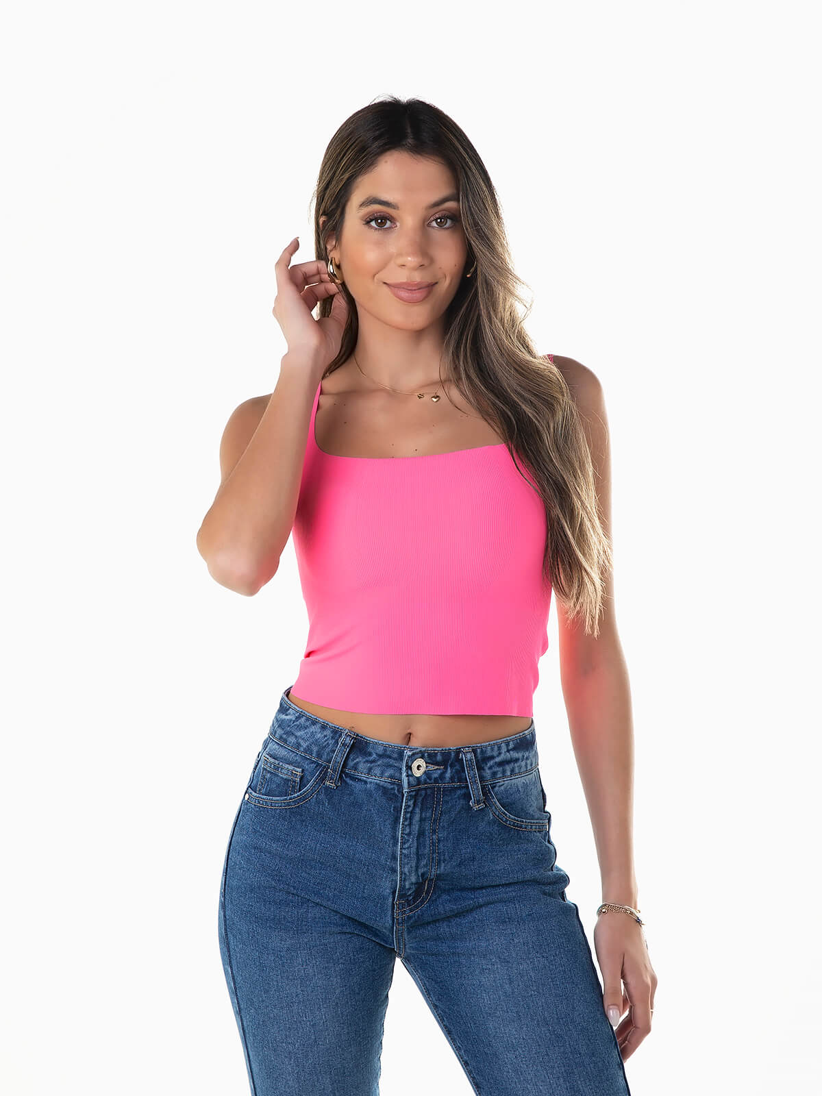 Top curto sem costuras confeccionado em tecido leve e elástico para maior conforto. Top alças com decote quadrado. Interior com peito almofadado removível.