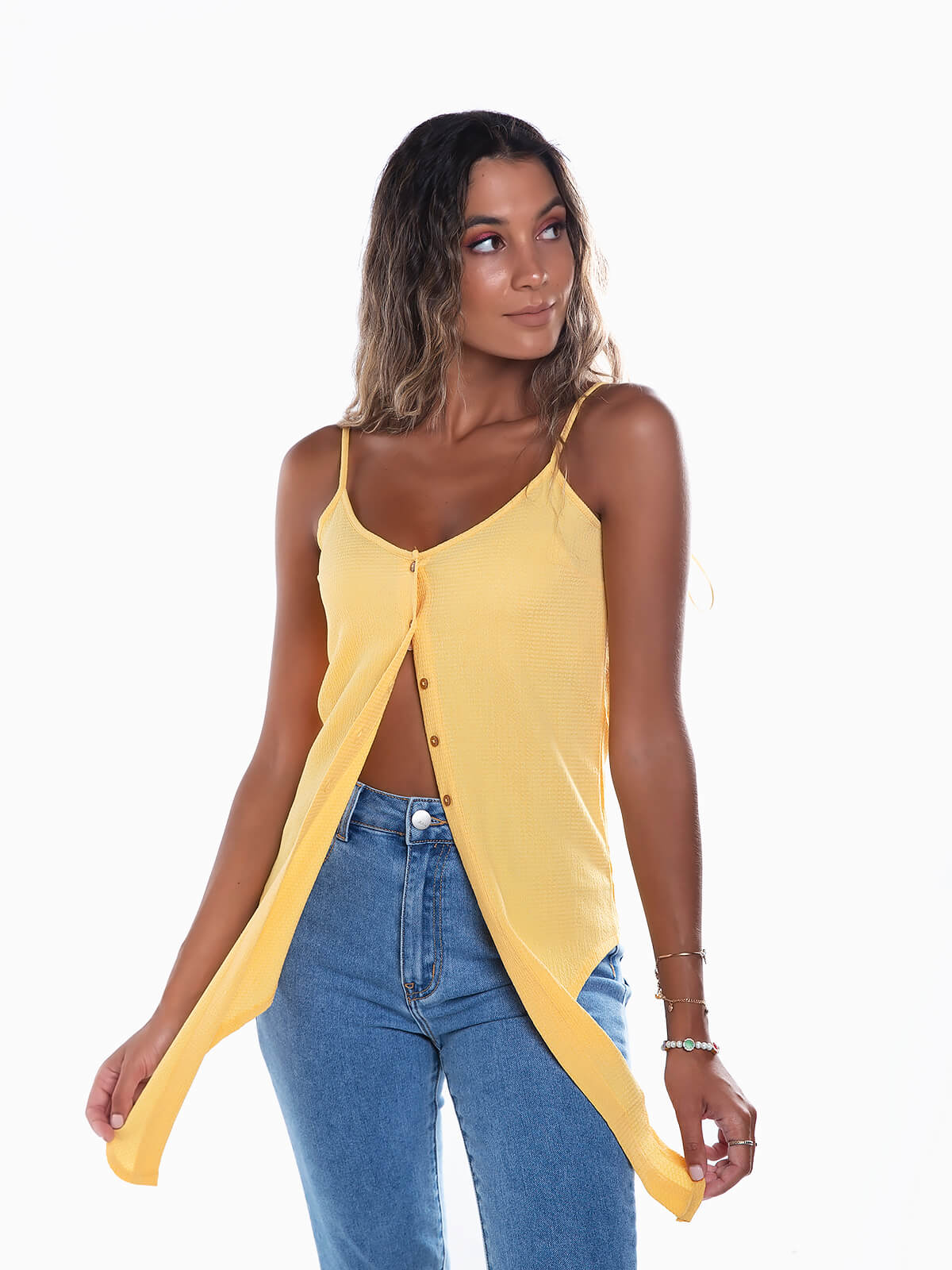 Top de alças finas em tecido com textura. Top com tecido para nó na base. Alças reguláveis. Decote redondo.