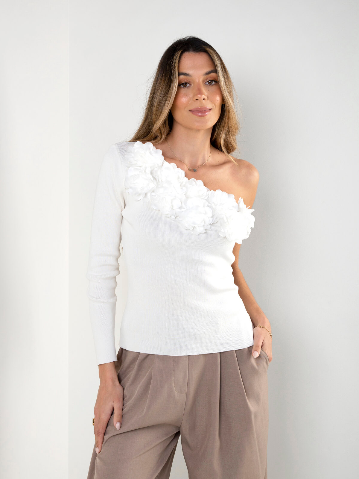 Top pérola assimétrico com detalhe floral aplicado que acrescenta um toque elegante e feminino ao look. Modelo de corte moderno, ideal para combinar com calças de alfaiataria, ganga ou saias.