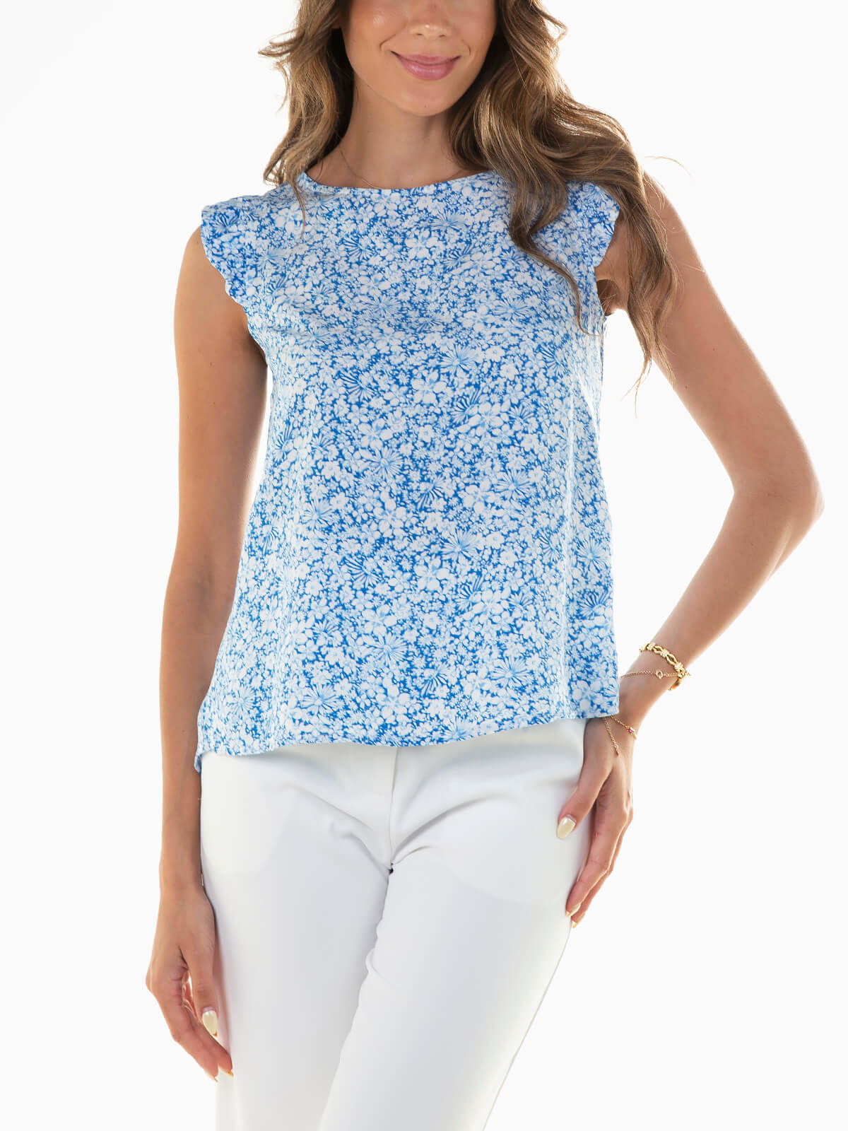 Top azul sem mangas com folho aplicado na cava. Top estampado floral com decote redondo.