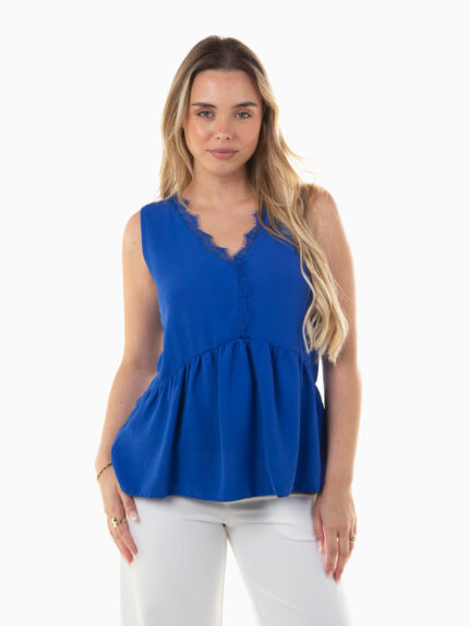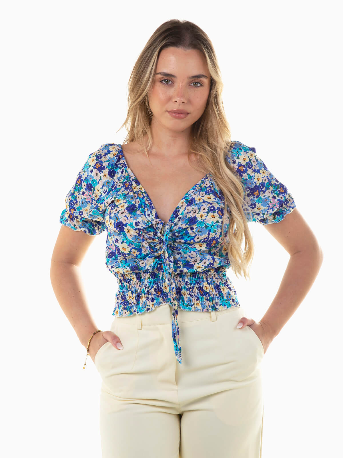 Top azul estampado floral para mulher. Crop top manga curta com cordão para franzir à frente. Decote em V. Franzido smock na base.