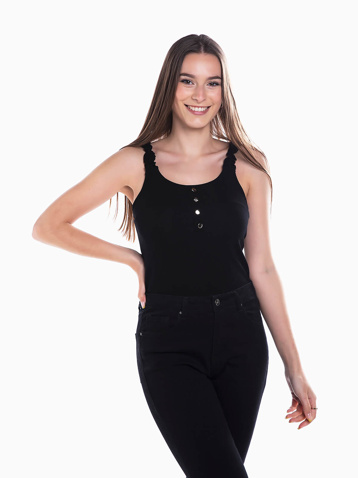 Top básico justo de alças finas com folhos. Top para senhora com botões na frente. Gola redonda.