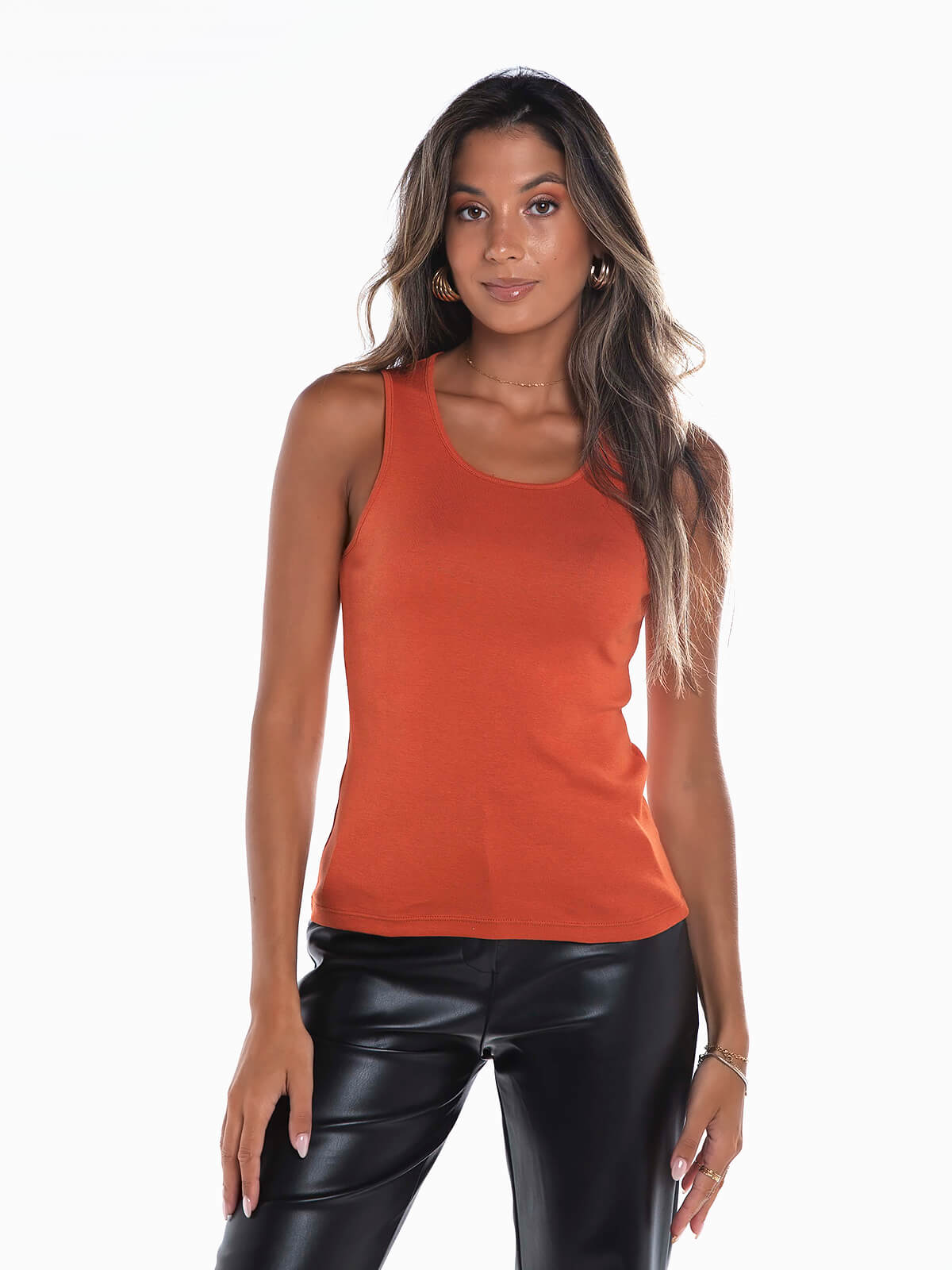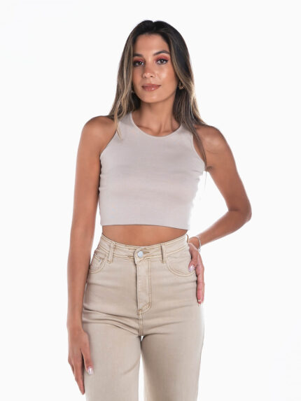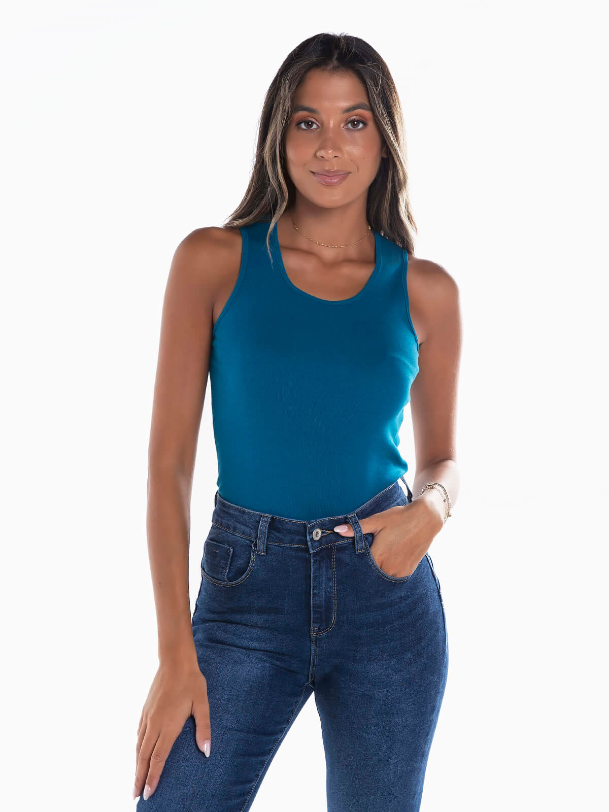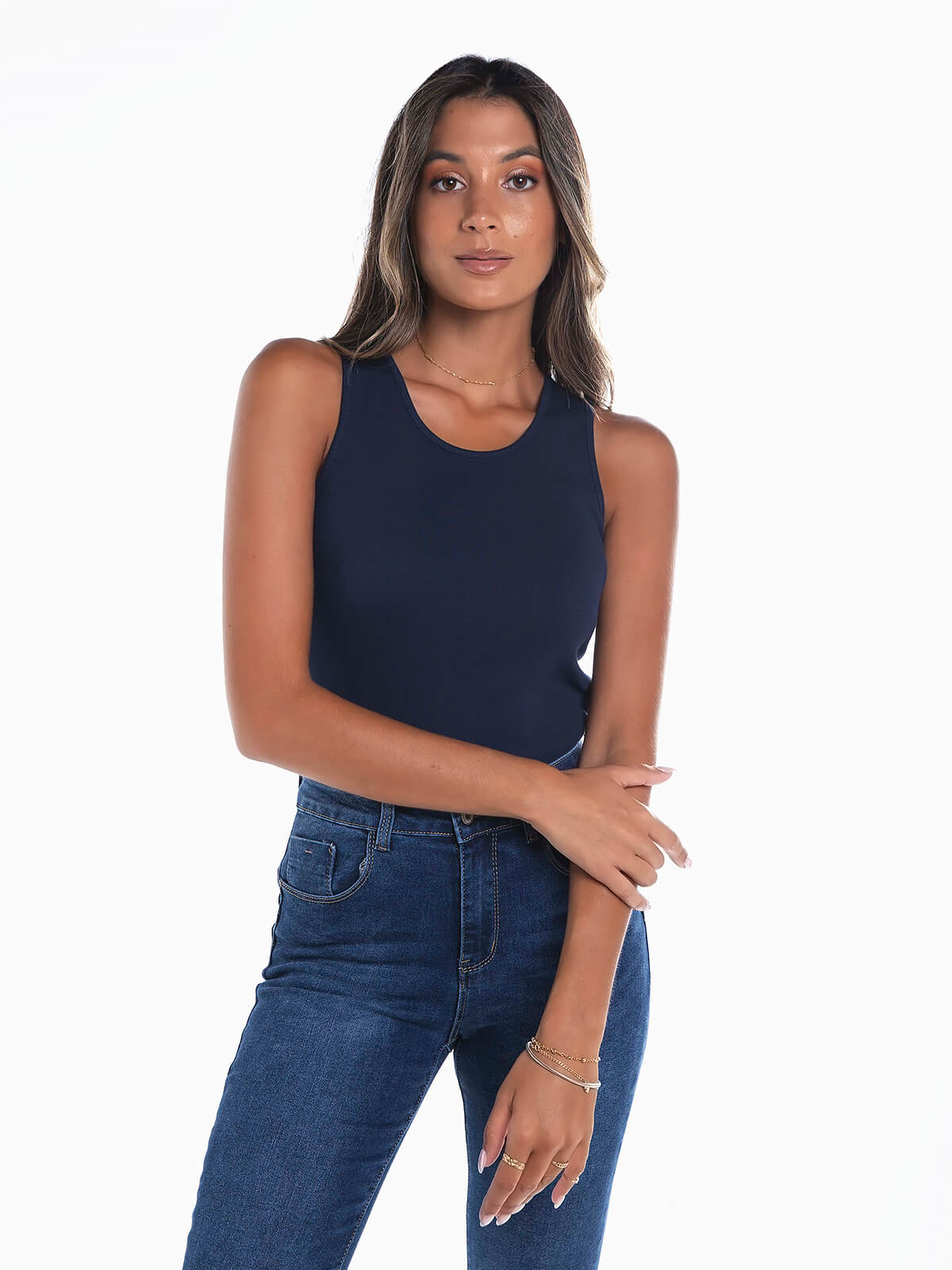 Top básico de manga cava para senhora. Top 100% algodão com decote redondo.