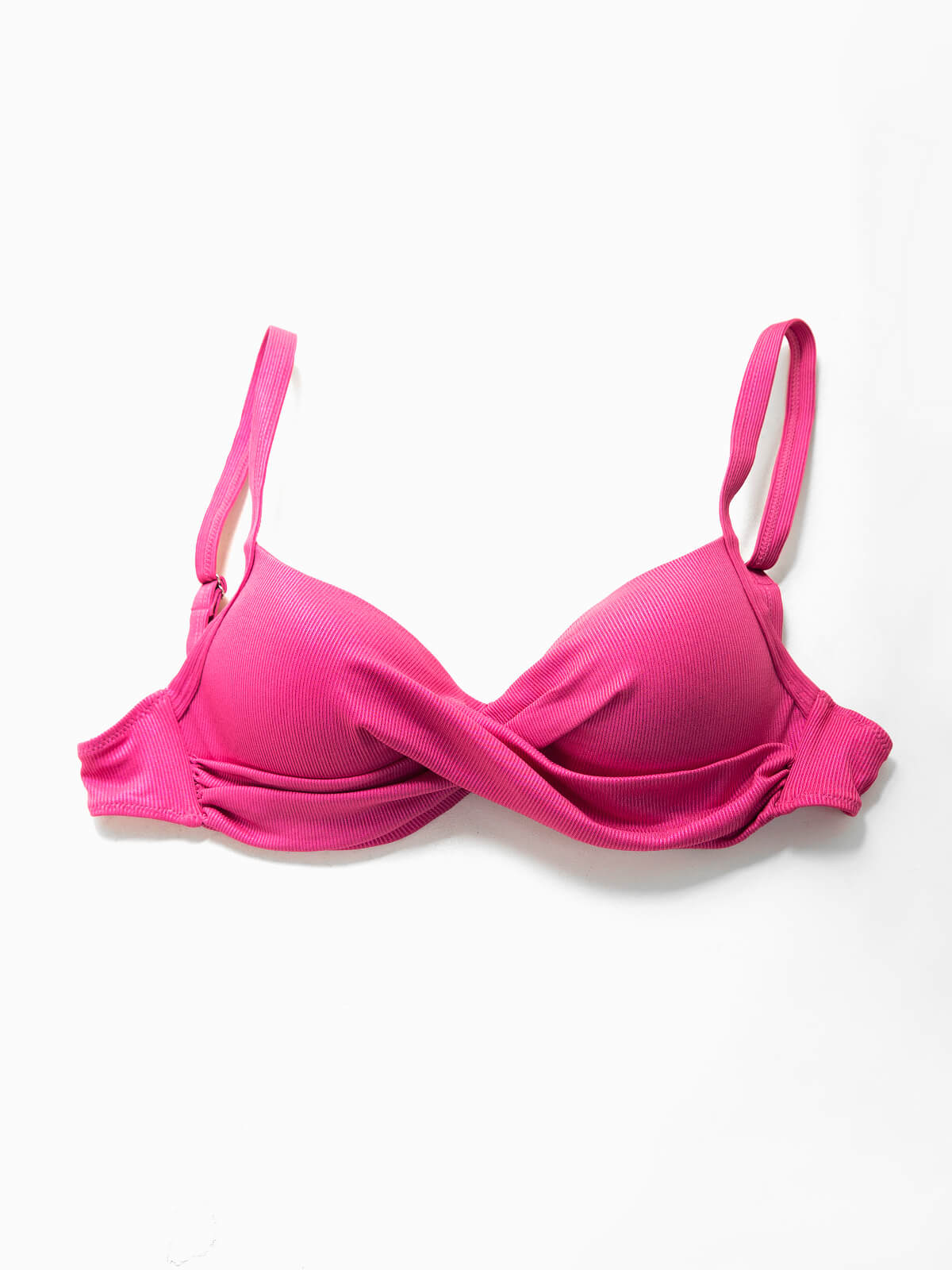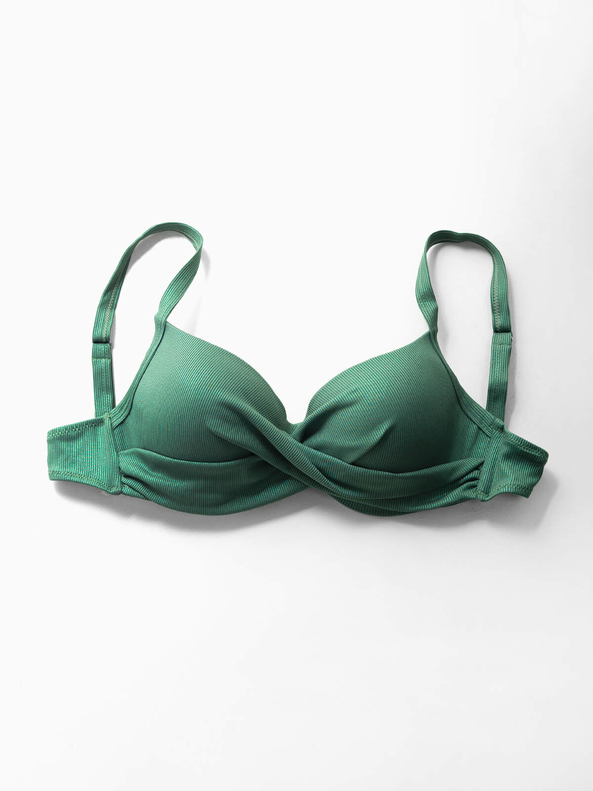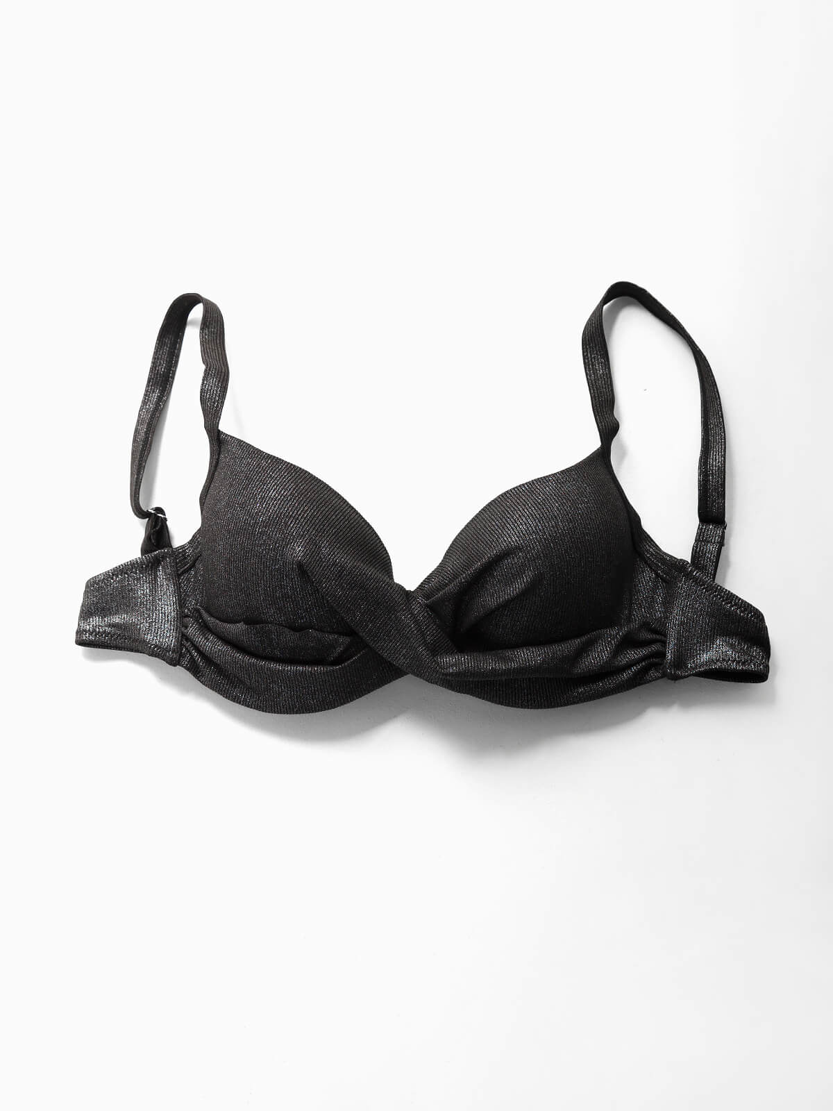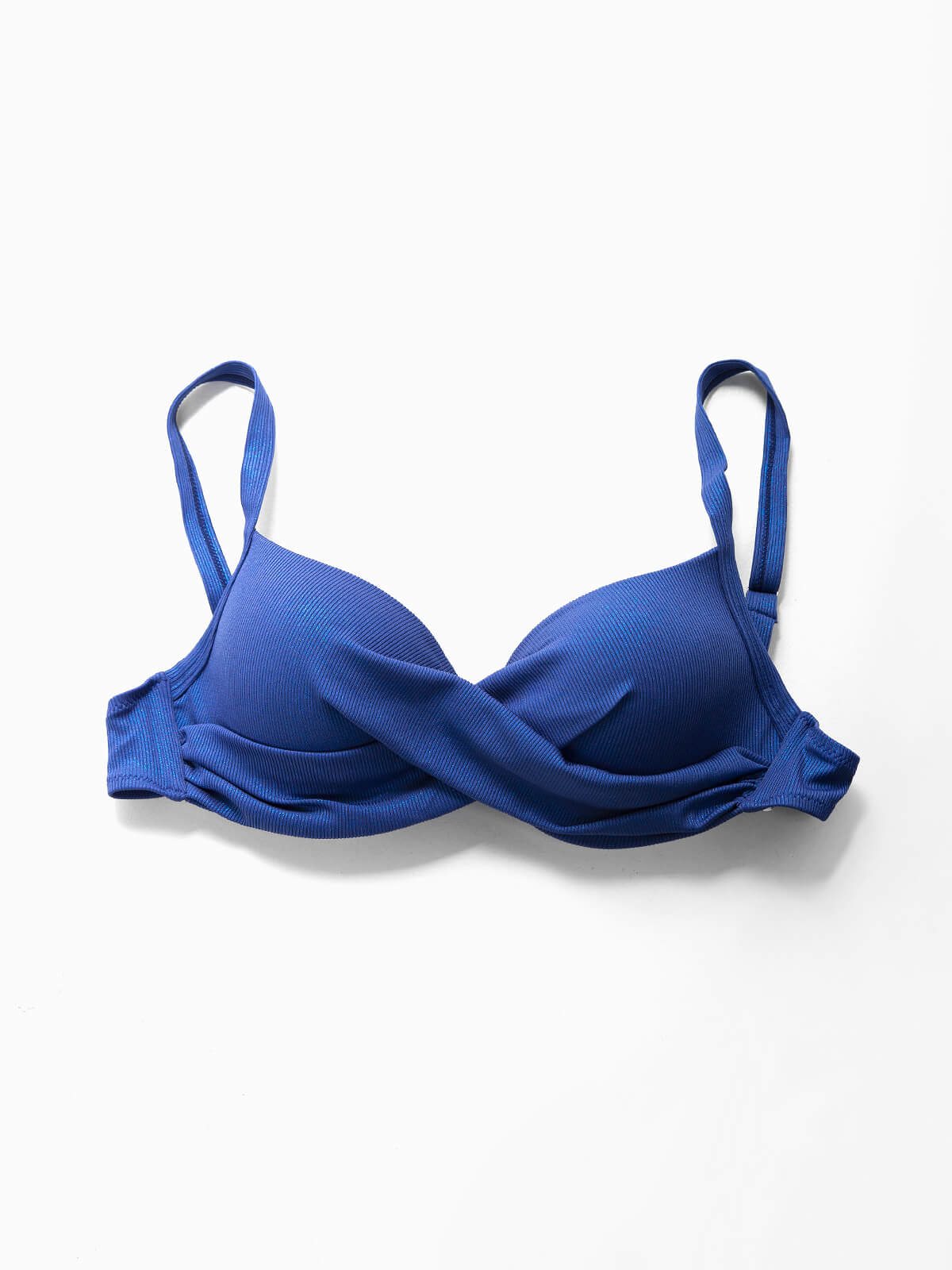 Top de biquíni balconette canelado com brilho para mulher. Top plus size com pormenor cruzado à frente, alças ajustáveis e aperto de laço. Copas com aro para melhor suporte. Tamanhos Grandes.