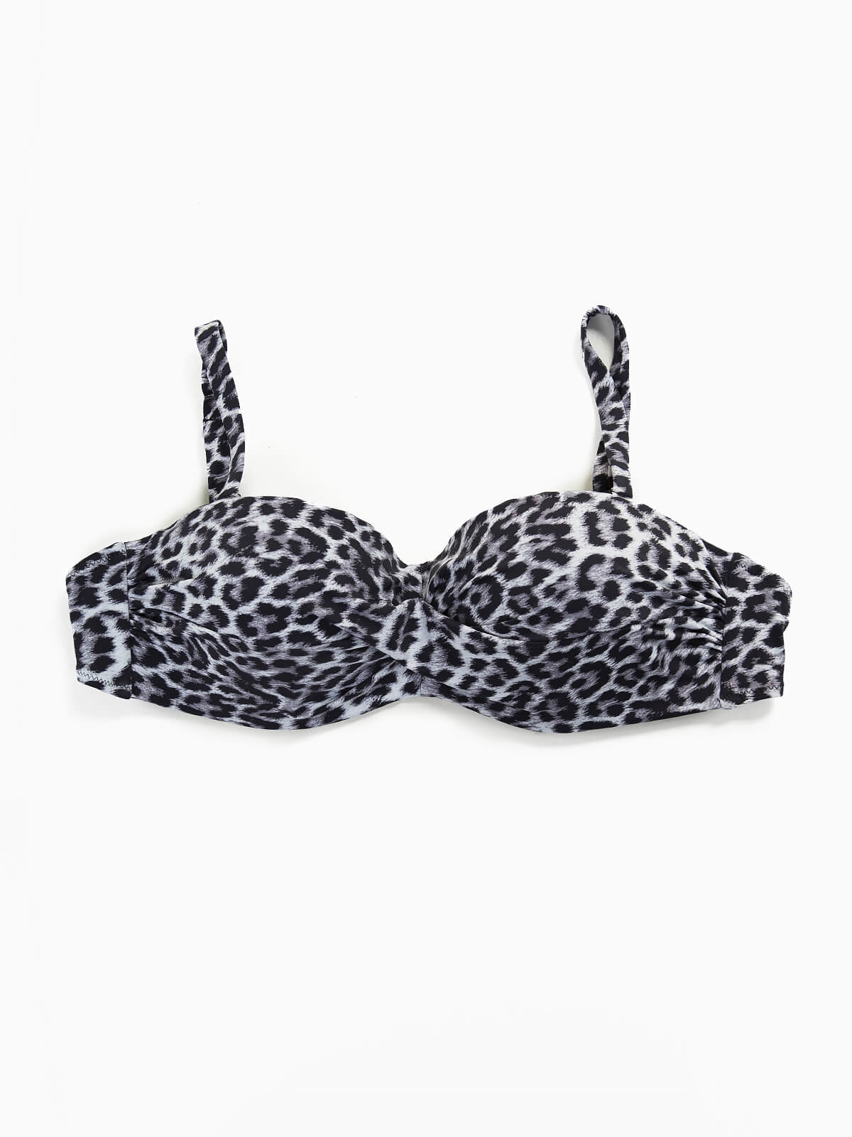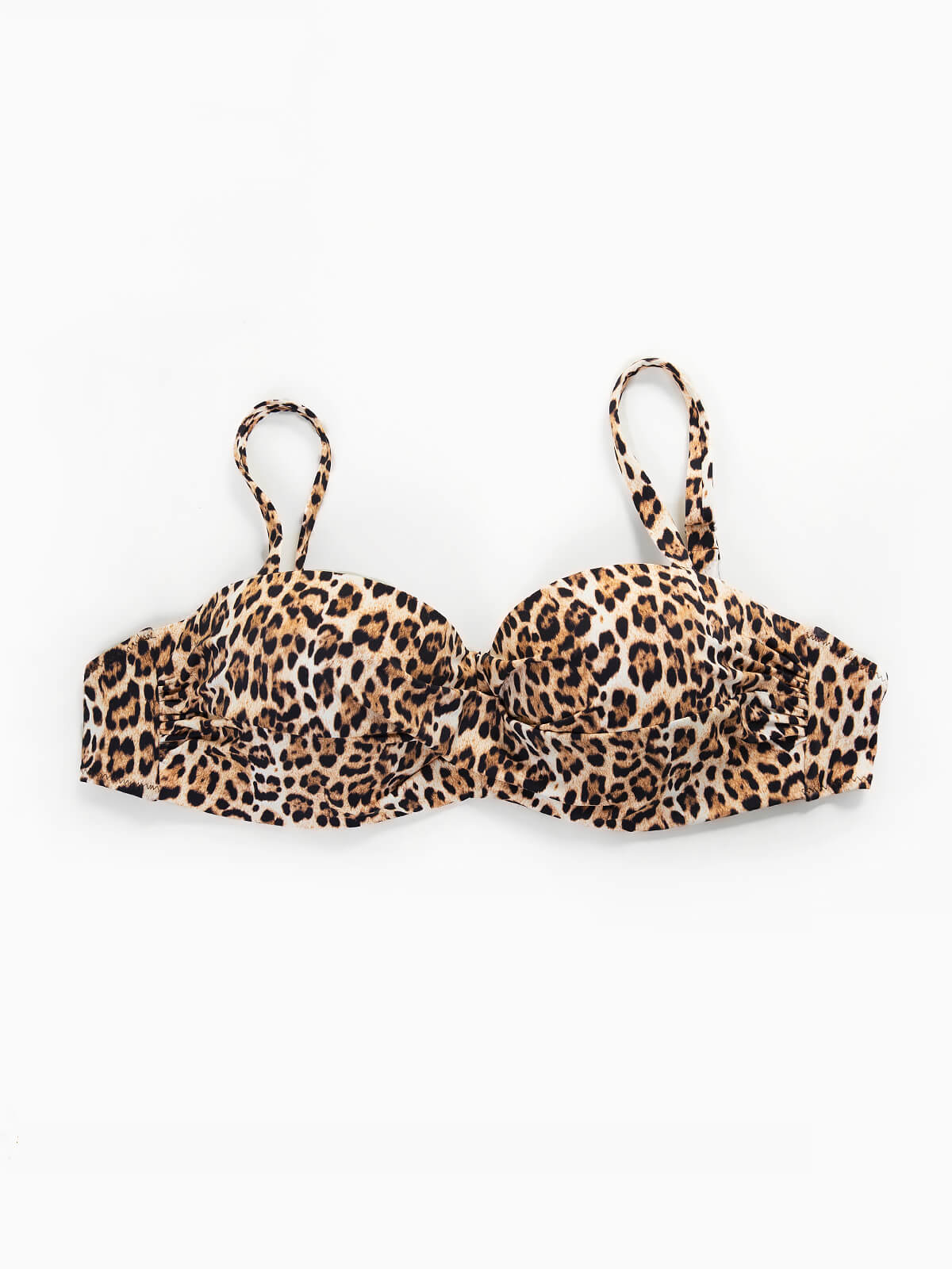 Top bandeau de biquíni com estampado leopardo para senhora. Top almofadado com efeito push-up para oferecer melhor suporte. Aperto posterior de laço.