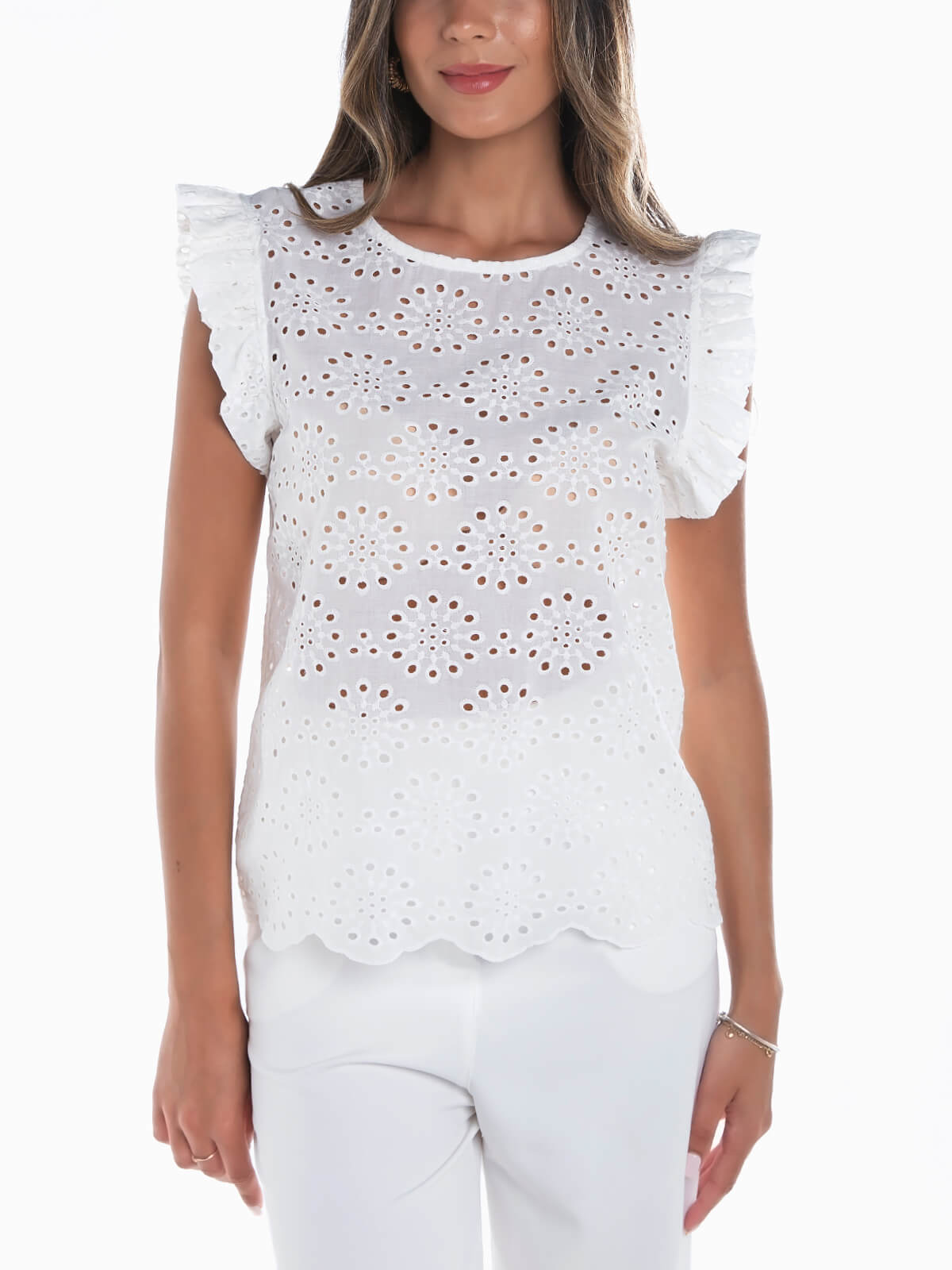 Top branco em bordado inglês para senhora. Top sem mangas com encaixe de folho na cava. Decote redondo. Aperto posterior de botão.