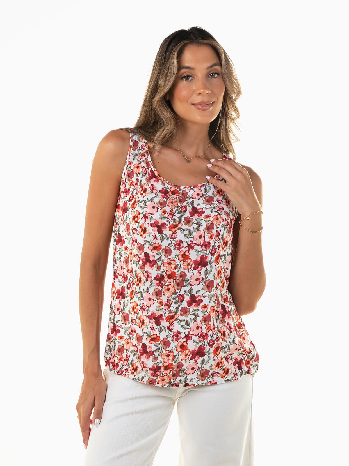 Top branco com padrão floral em contraste. Top fresco 100% viscose, sem mangas com decote redondo e aperto posterior de botão.