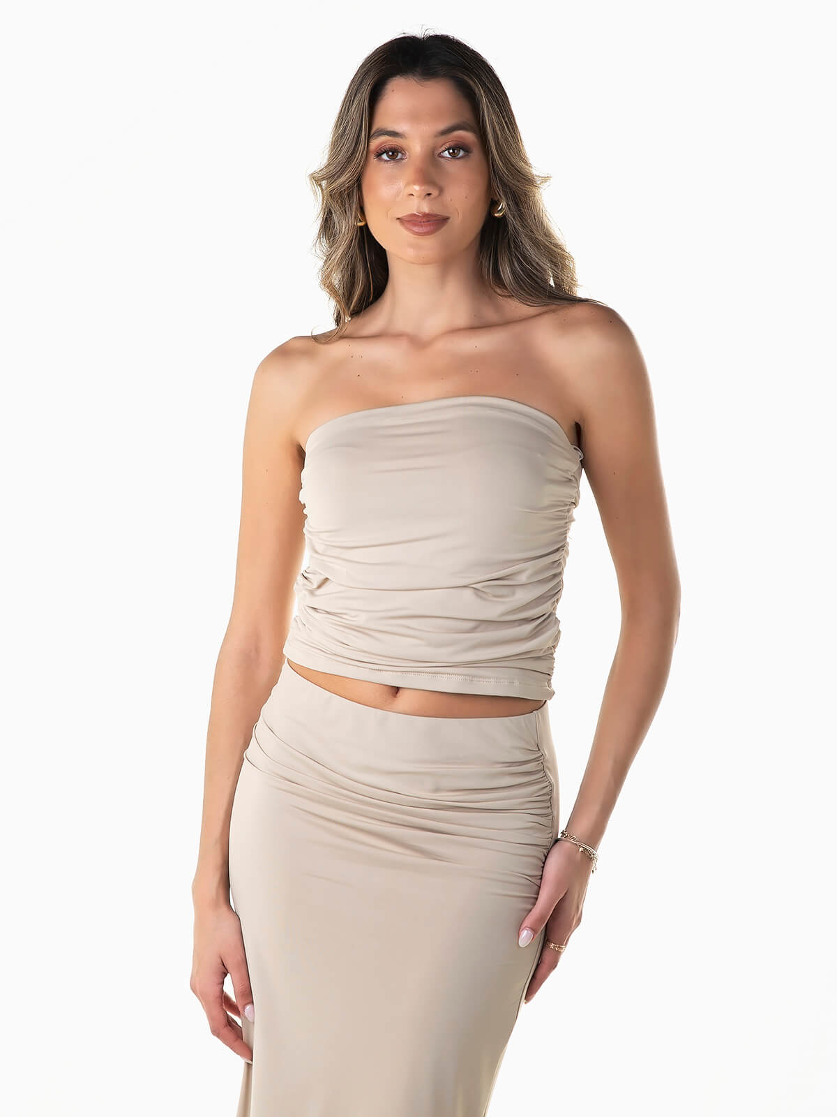 Top cai-cai com franzido nas laterais. Top ombros descobertos confeccionado em tecido elástico.