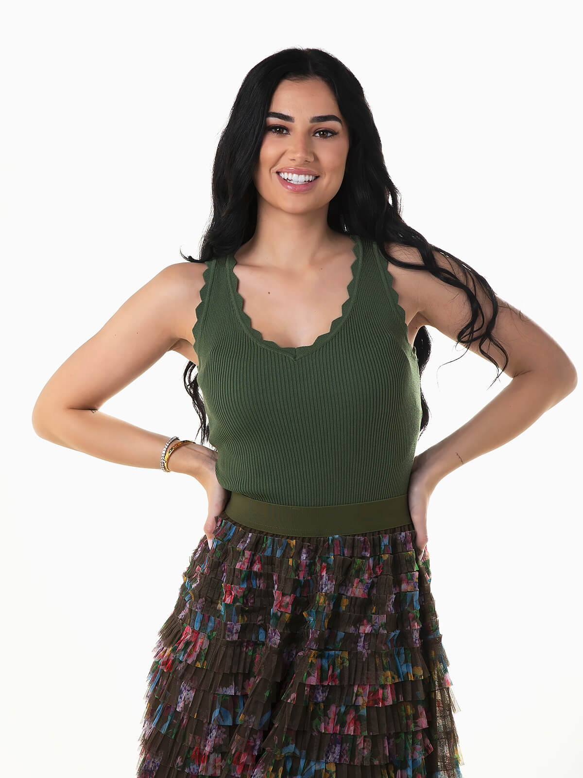 Top em malha canelada com decote em bico recortado. Top justo sem mangas para senhora.