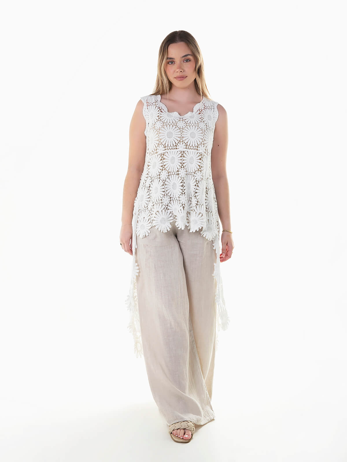 Top crochet assimétrico para senhora. Top de manga cava 100% algodão com decote redondo. Cós mais comprido atrás.