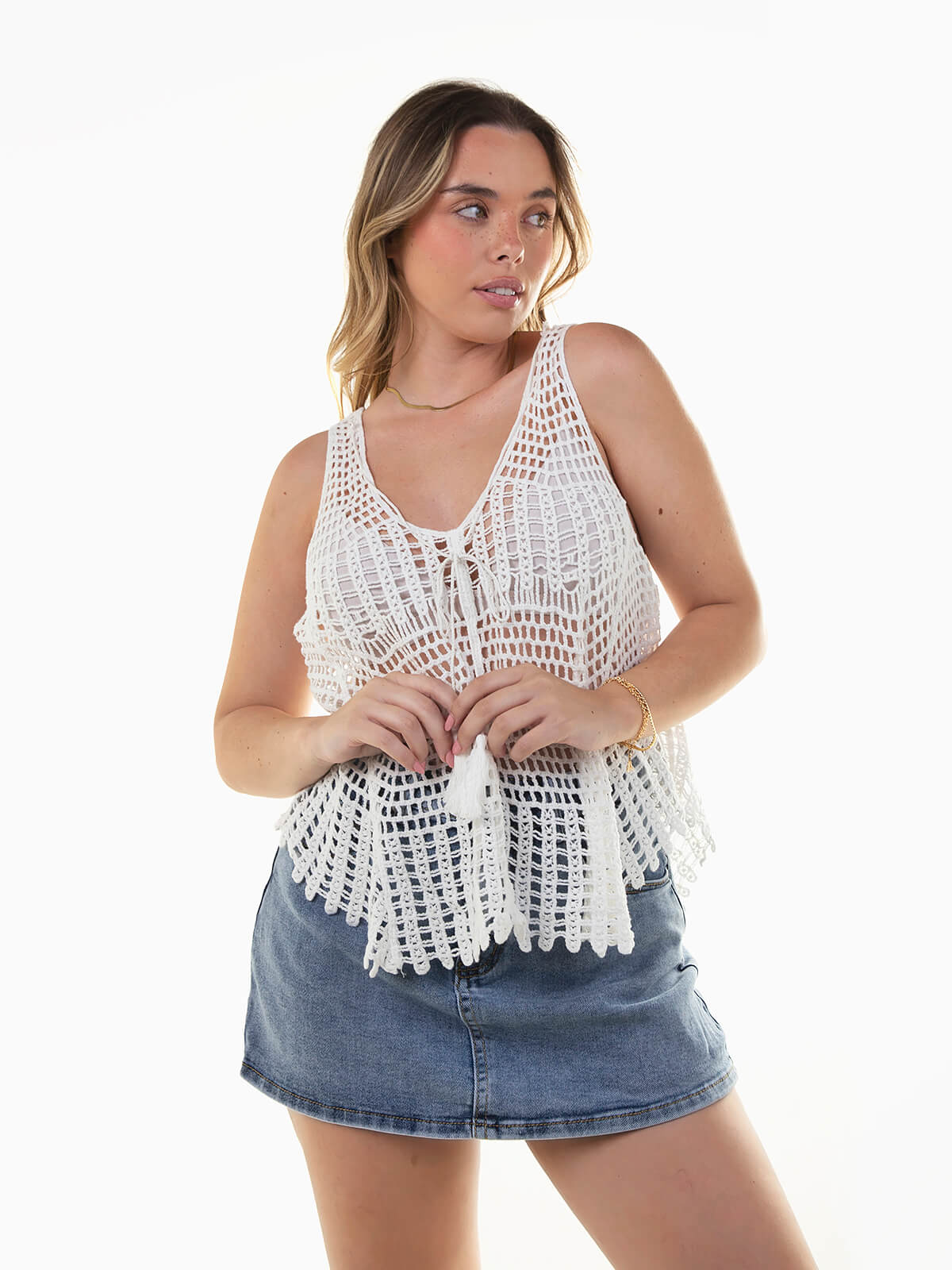 Top em crochet com decote em V e cordão com franjas. Modelo sem mangas com padrão rendado e acabamento artesanal, perfeito para criar looks estilo boho. Ideal para usar com calças fluídas, calções ou sobre um biquíni nos dias de verão.