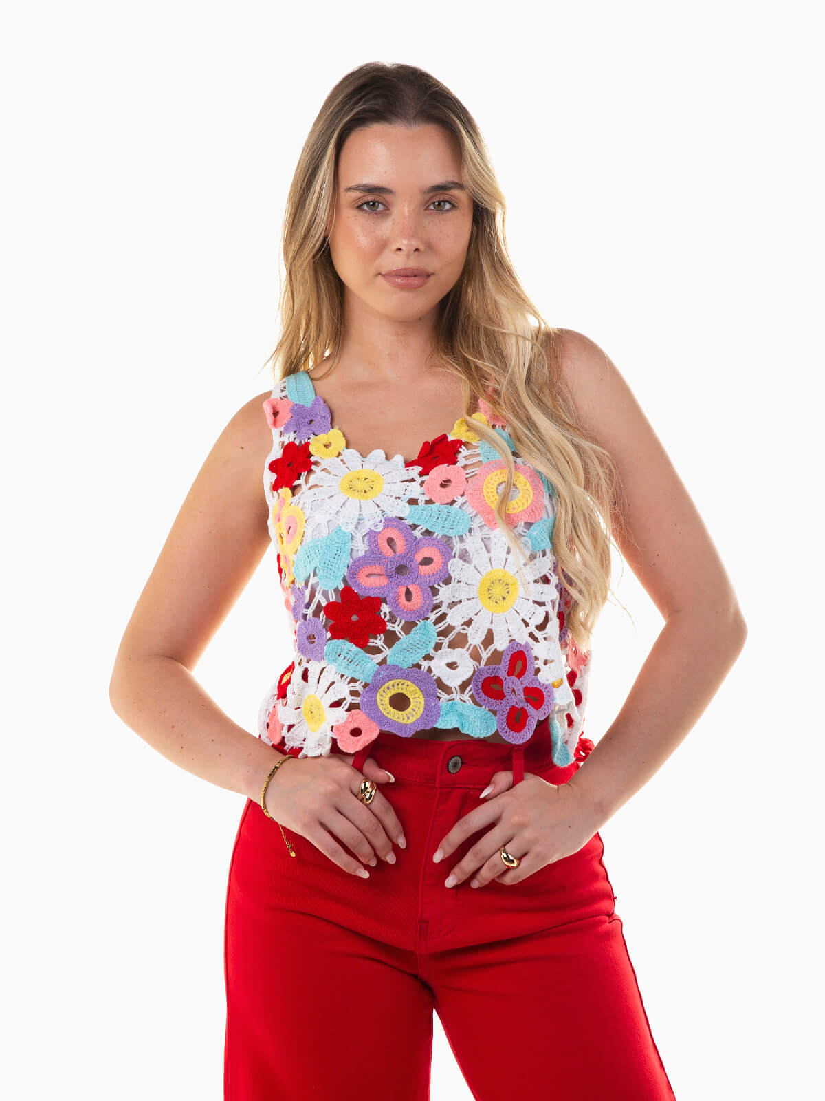 Top alças em crochet para mulher. Apresenta um padrão delicado de flores que realça a feminilidade e o estilo boho-chic. Decote em V.