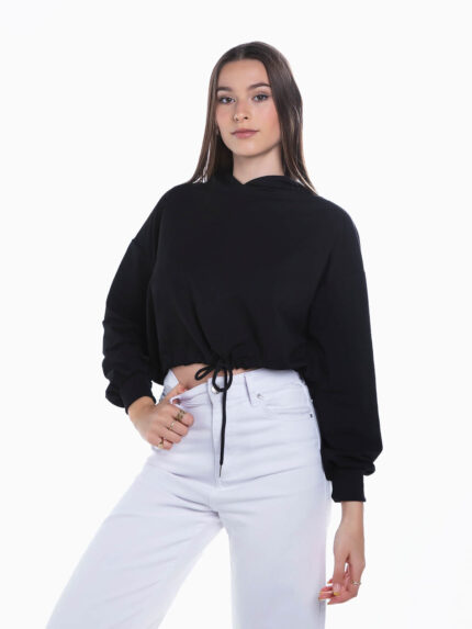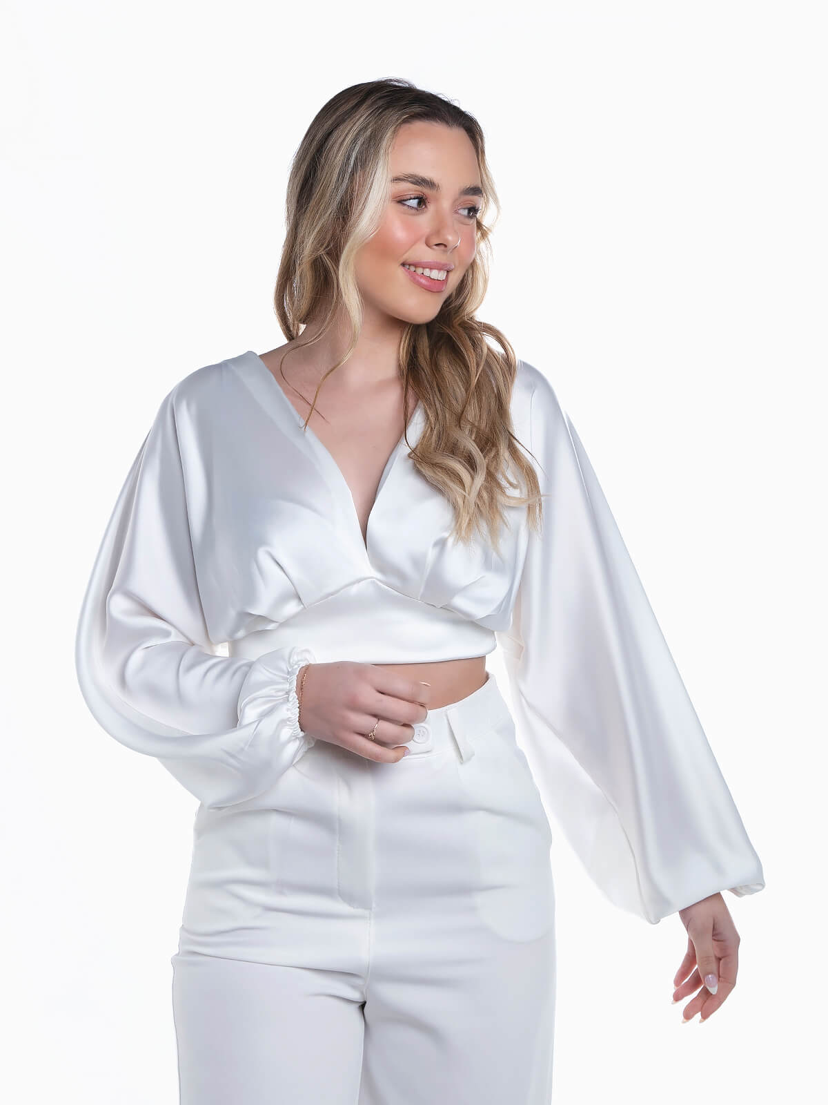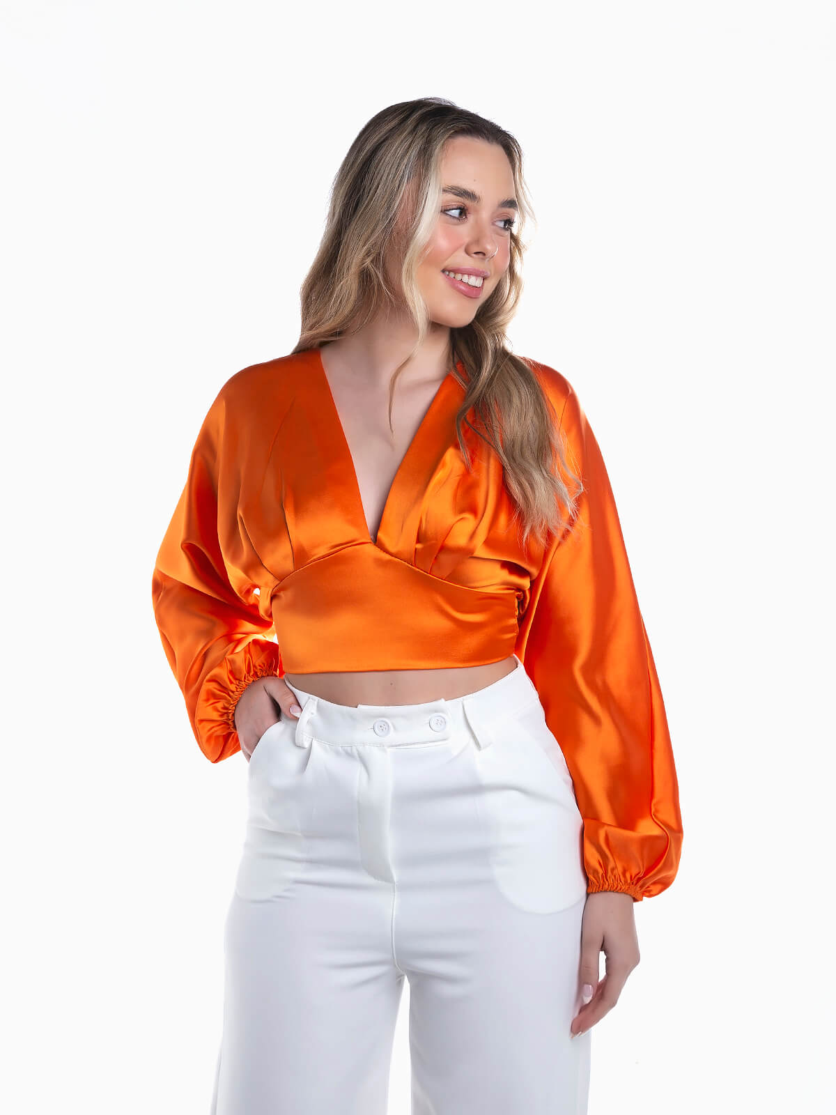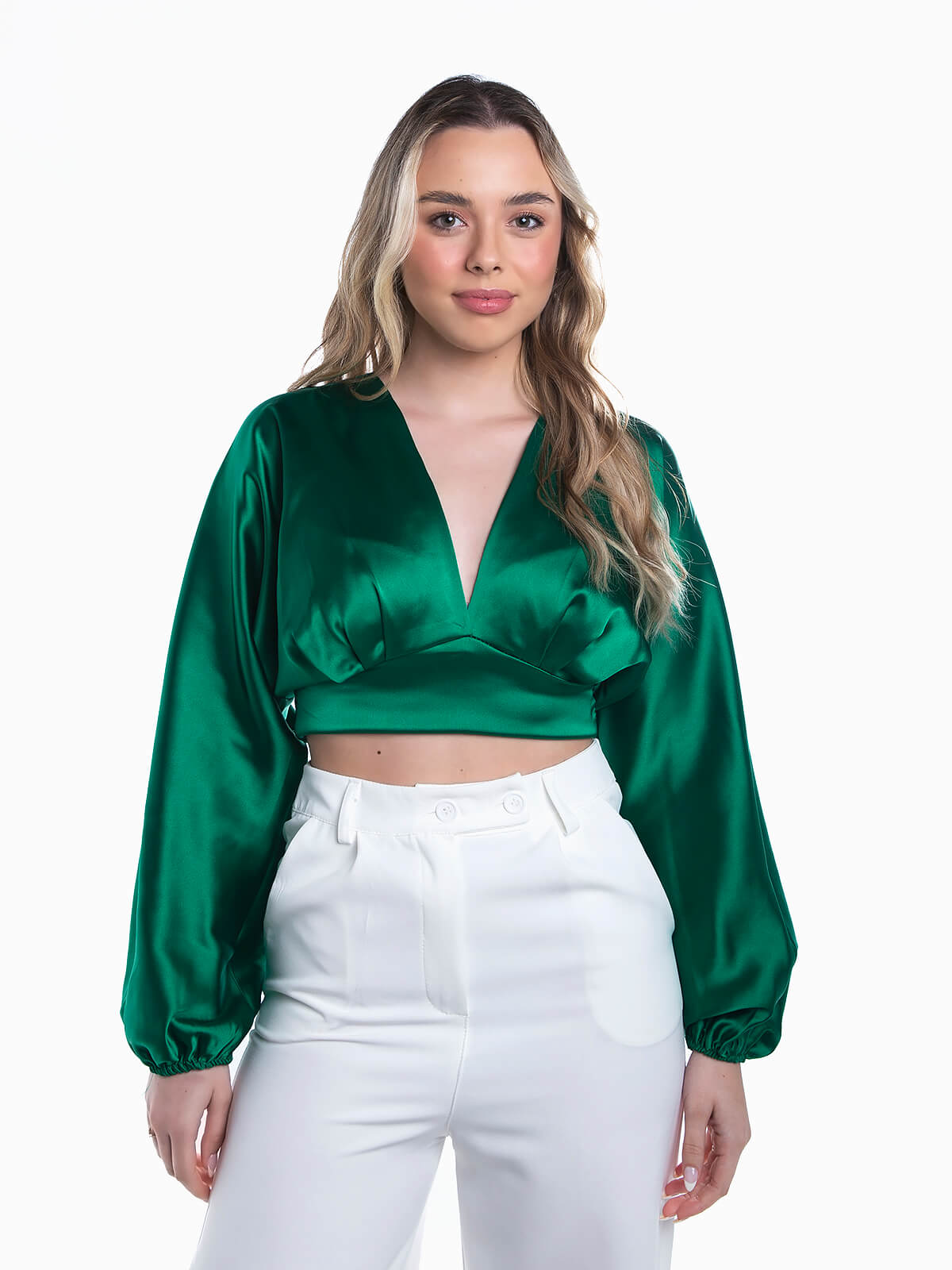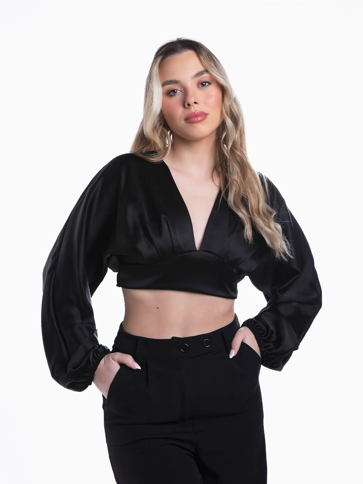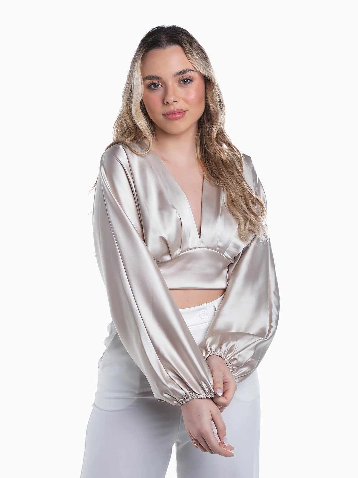 Top curto acetinado com decote em V para senhora. Top de manga comprida com punhos elásticos. Cós com parte posterior franzida. Costas abertas com tecido para aperto de laço.