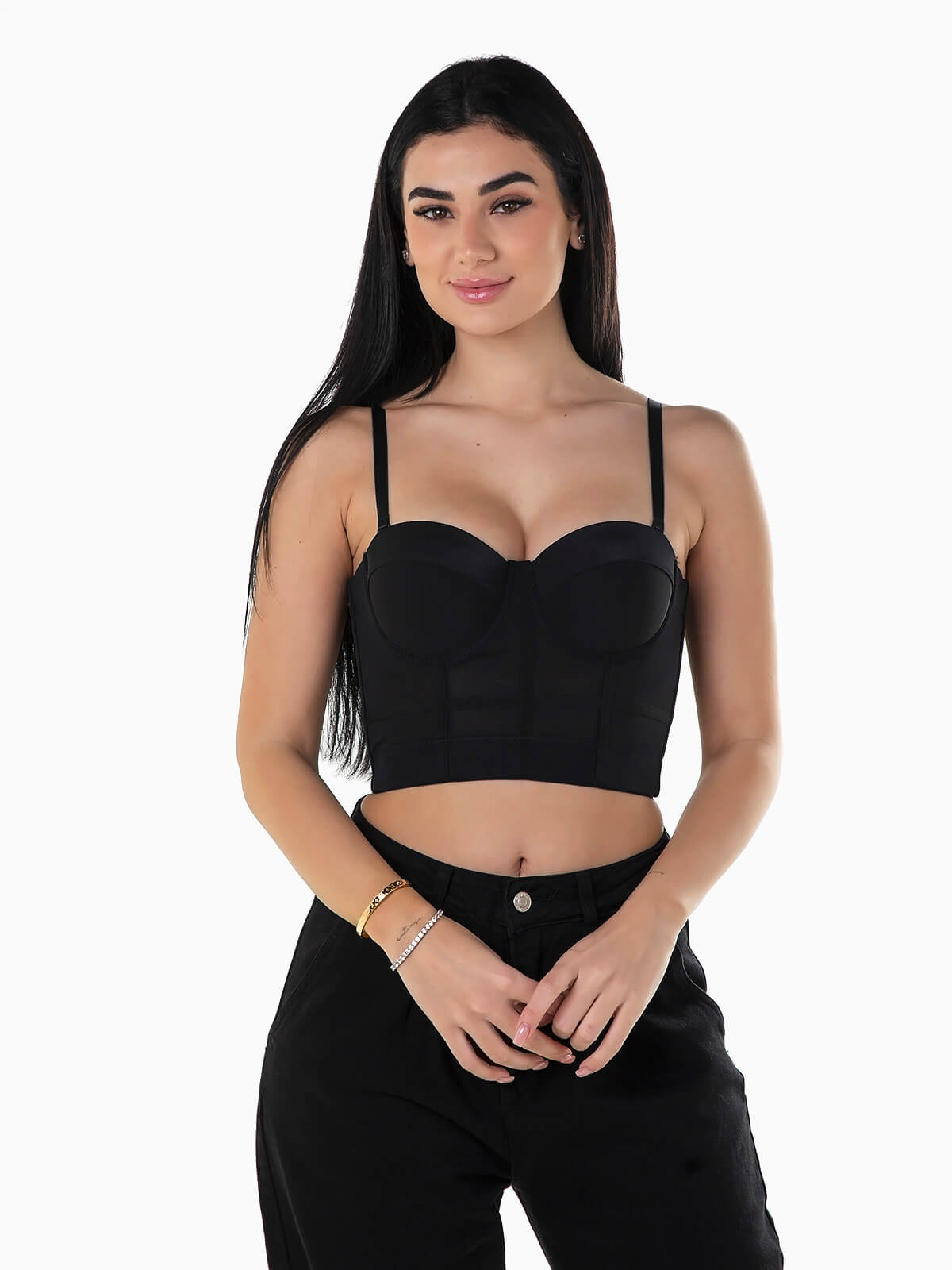Top curto de alças estilo corpete para senhora. Top com peito almofadado e bandas interiores de silicone para melhor suporte e conforto. Decote quadrado. Pormenores transparentes. Aperto posterior de colchetes ajustáveis.