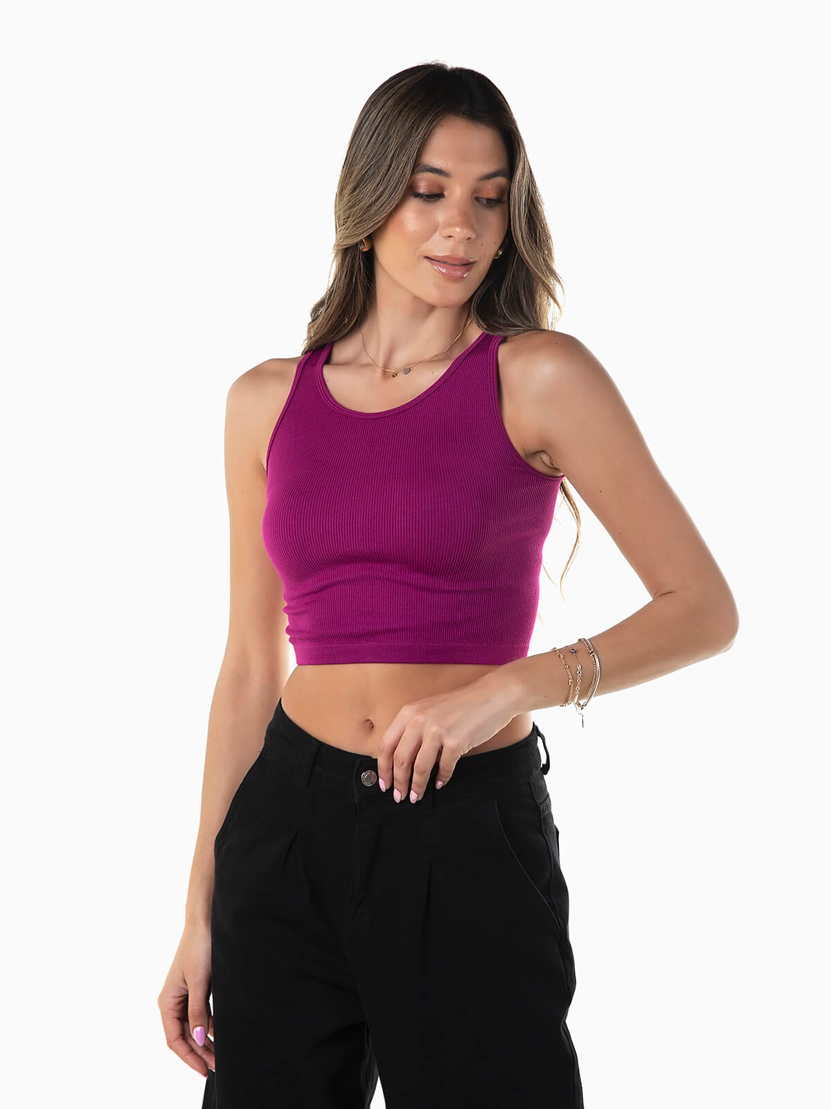 Top curto canelado elástico para senhora. Tank top de alças em poliamida com decote redondo.