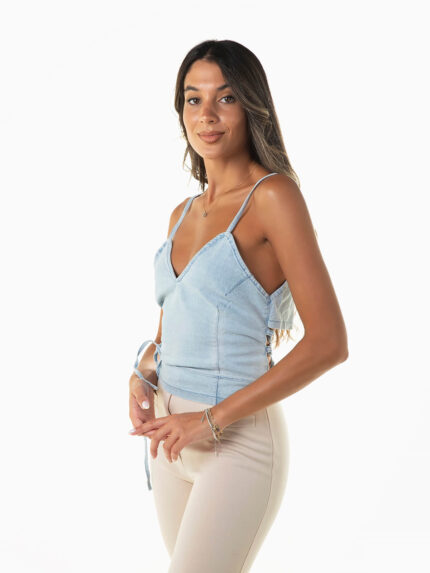Top curto de ganga com alças finas reguláveis. Top com pormenor de folho ao longo do decote coração. Fechos zíper nas laterias ocultos na costura.