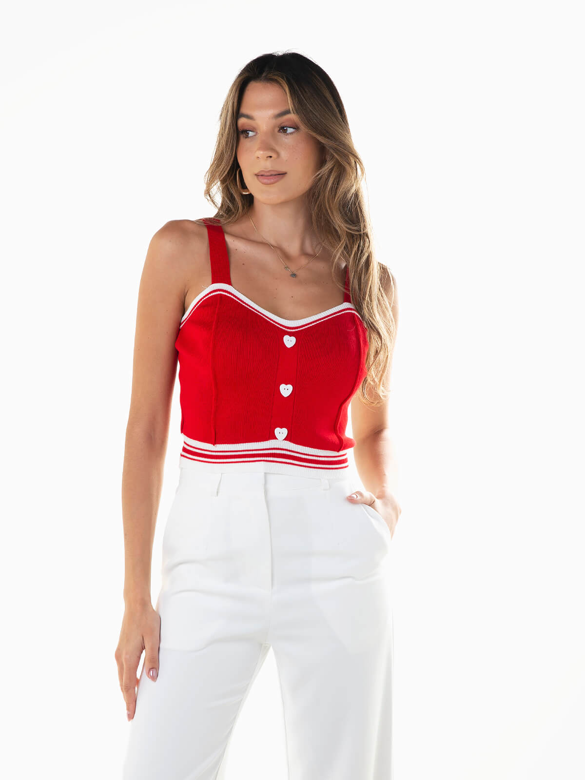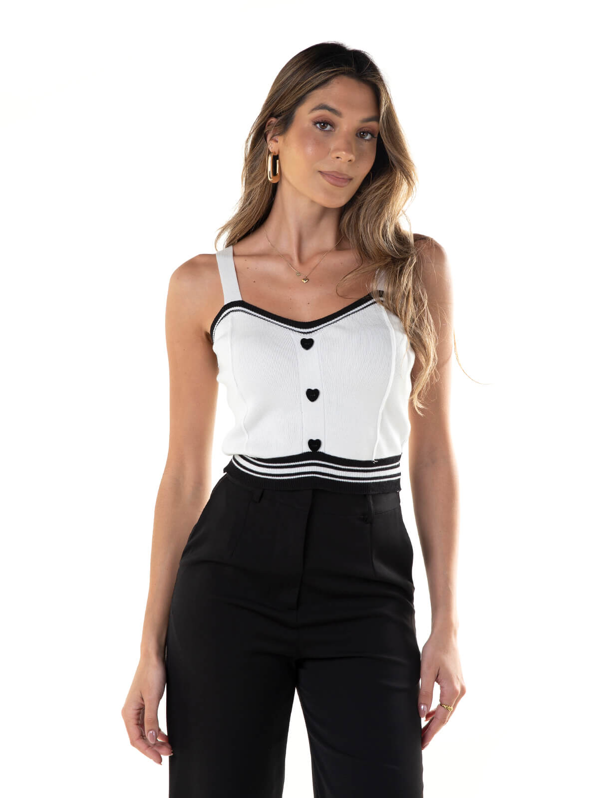 Top curto de malha com botões decorativos de coração em contraste. Crop top de alças com extremidades em contraste e costura reforçada à frente. Decote coração.