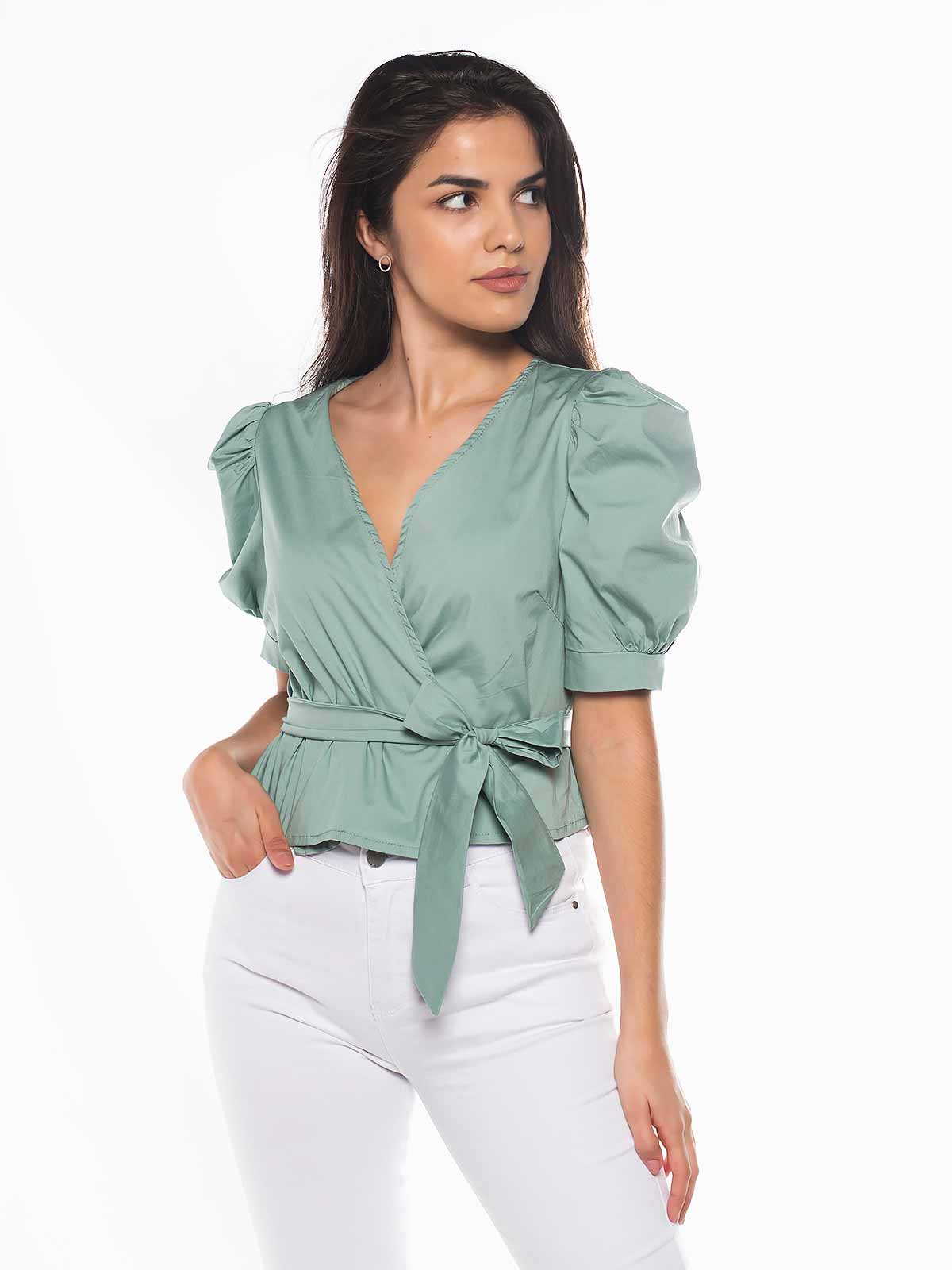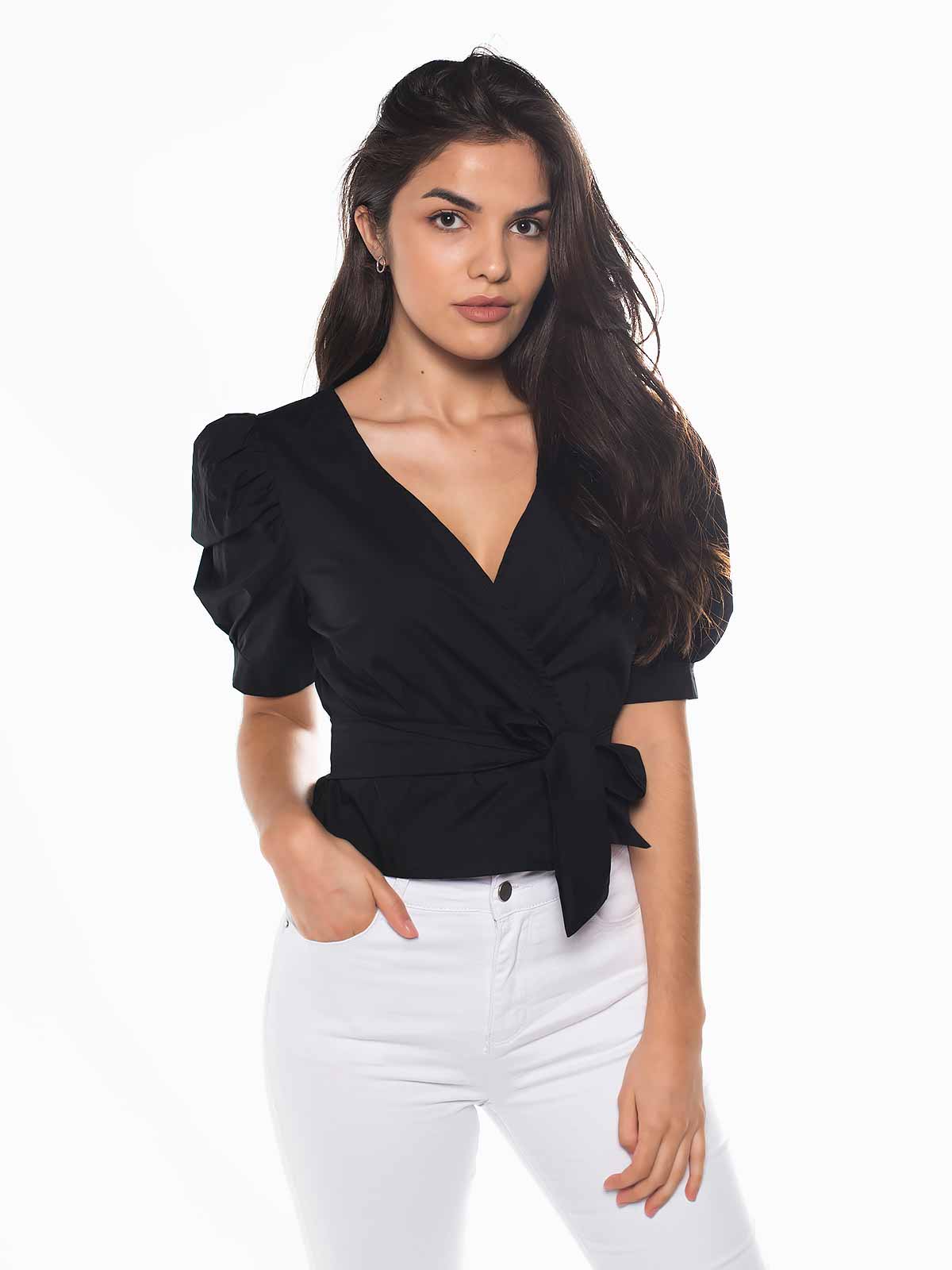 Top curto com manga curta balão. Crop top com decote em V trespassado e cinto para laço.