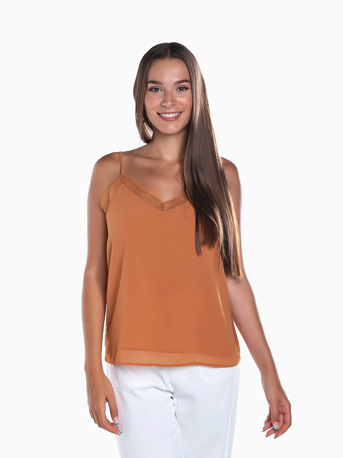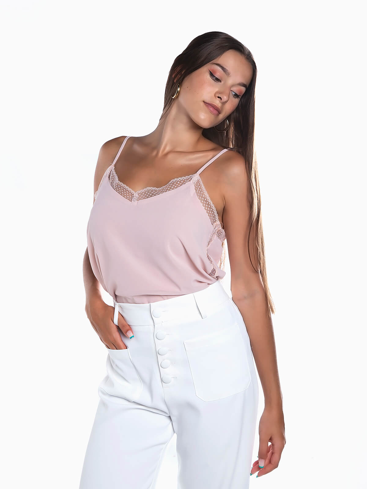 Top de alças finas reguláveis com encaixe de renda nas laterais e decote. Top comprido em tecido duplo com decote em bico.