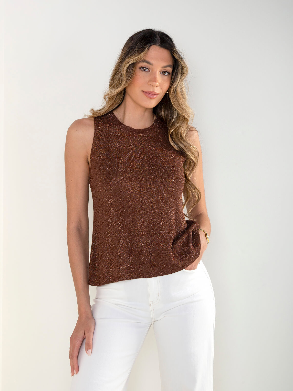 Top de malha sem mangas com fio de brilho. Corte simples e versátil, ideal para conjugar com looks do dia a dia ou dar um toque mais sofisticado a produções mais elegantes.