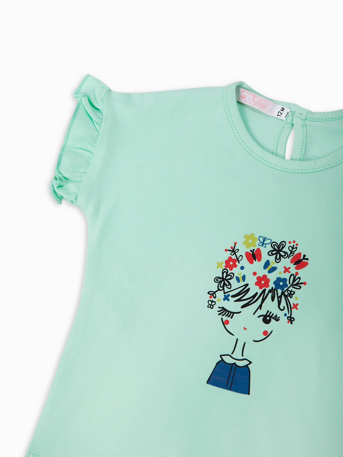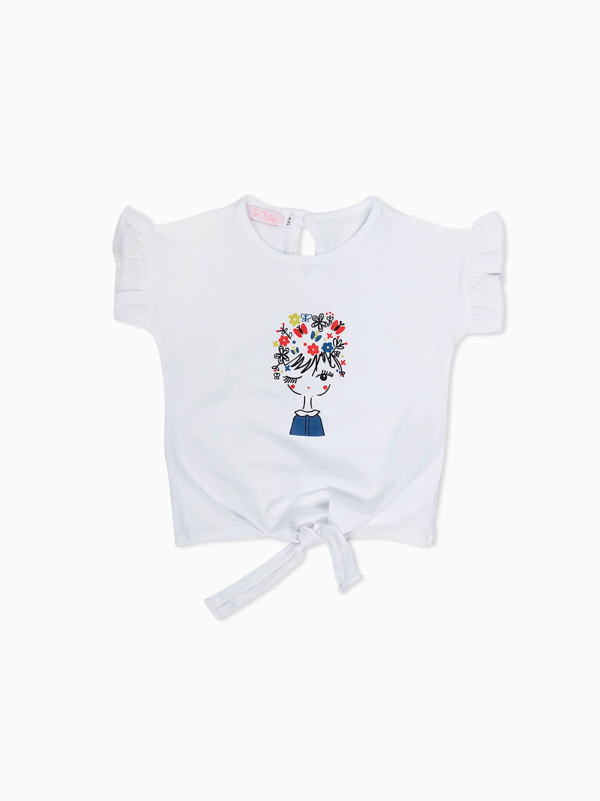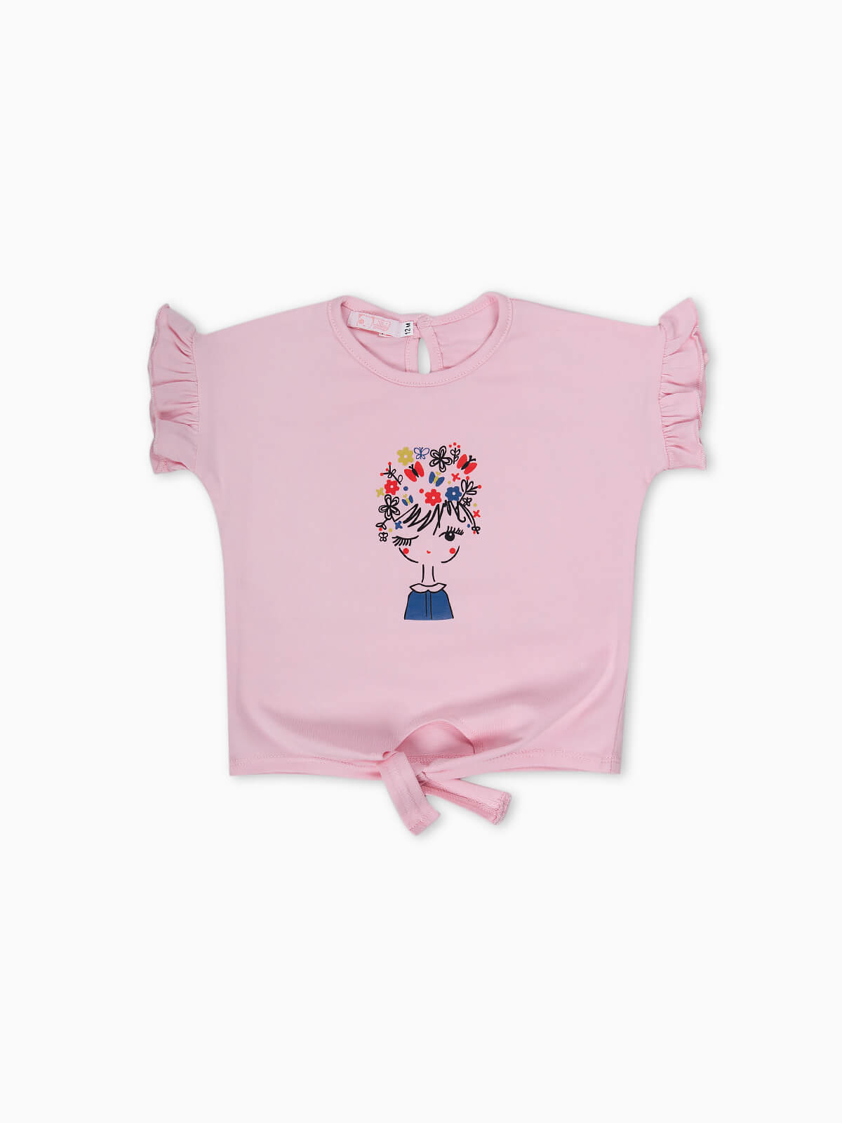 Top estampado com nó em baixo. Top de bebé sem mangas com folhos na cava. Gola redonda.