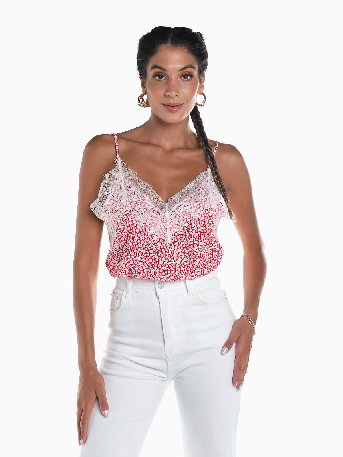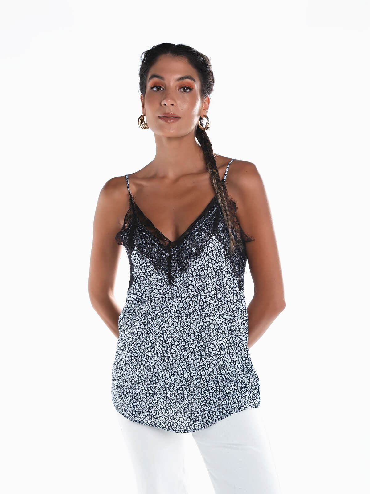 Top de alças reguláveis com encaixe de renda. Top para senhora com estampado floral e decote em bico.
