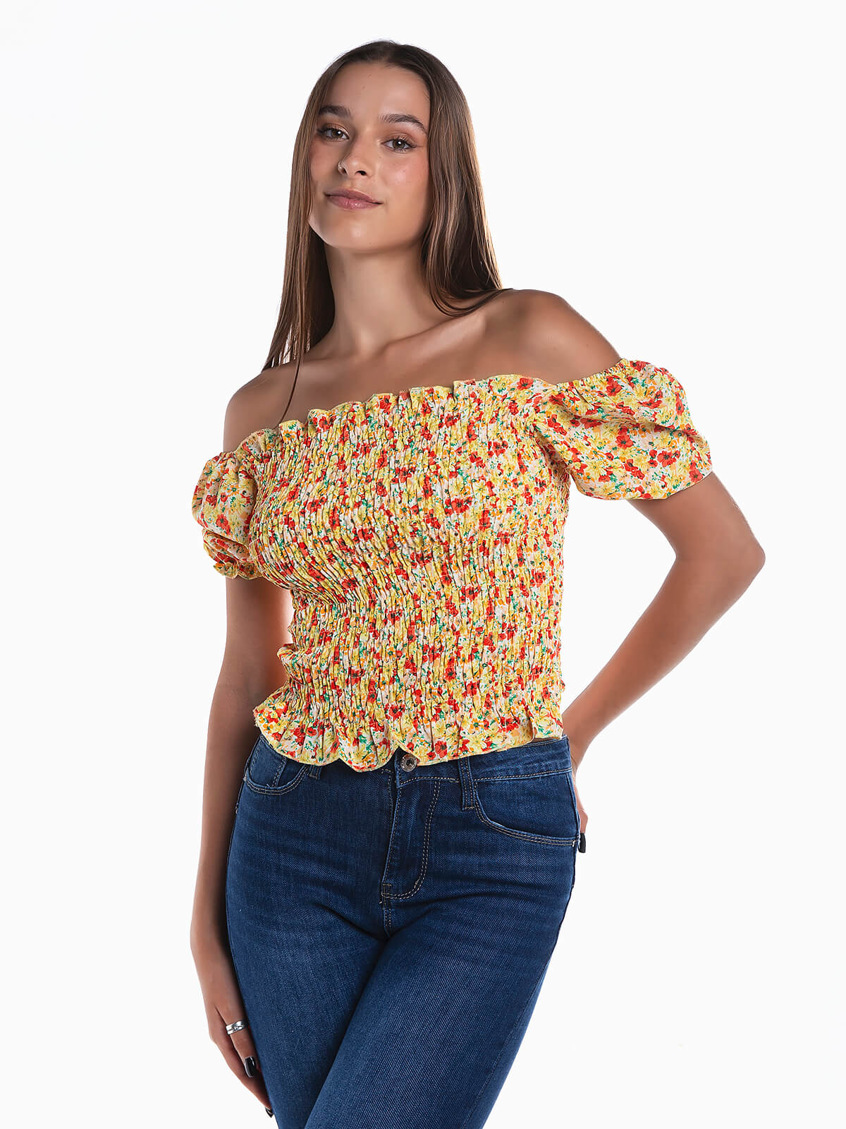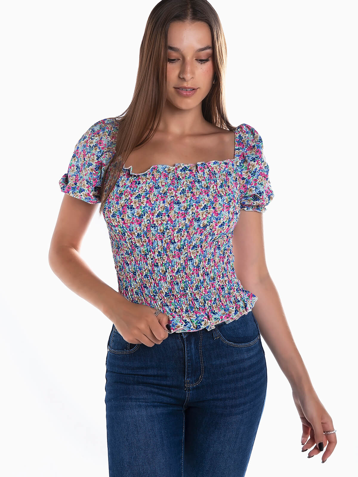 Top estampado floral em franzido smock elástico. Top para senhora manga curta com decote barco.