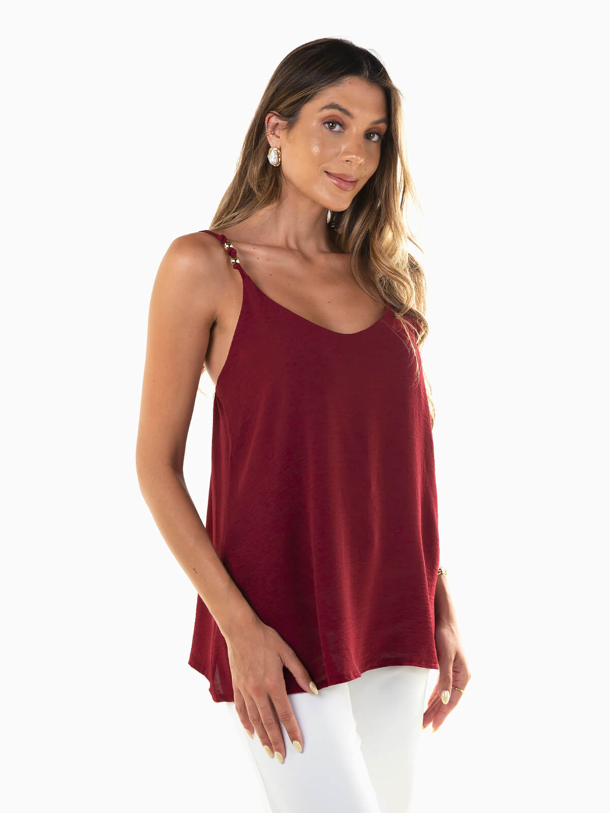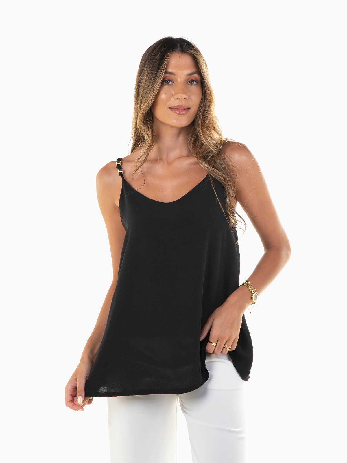Top fluído com aplicações douradas nas alças. Top para mulher com decote em V. Ideal para conjugar com calças, calções ou saias — um essencial moderno para looks práticos e cheios de estilo.