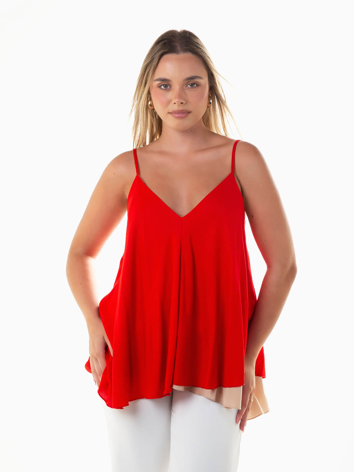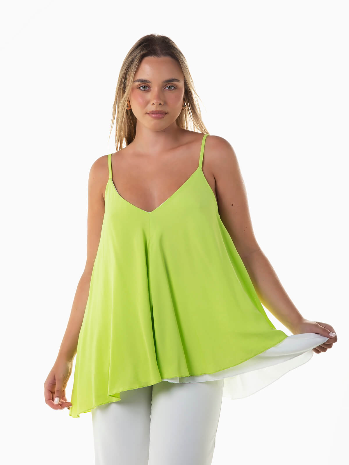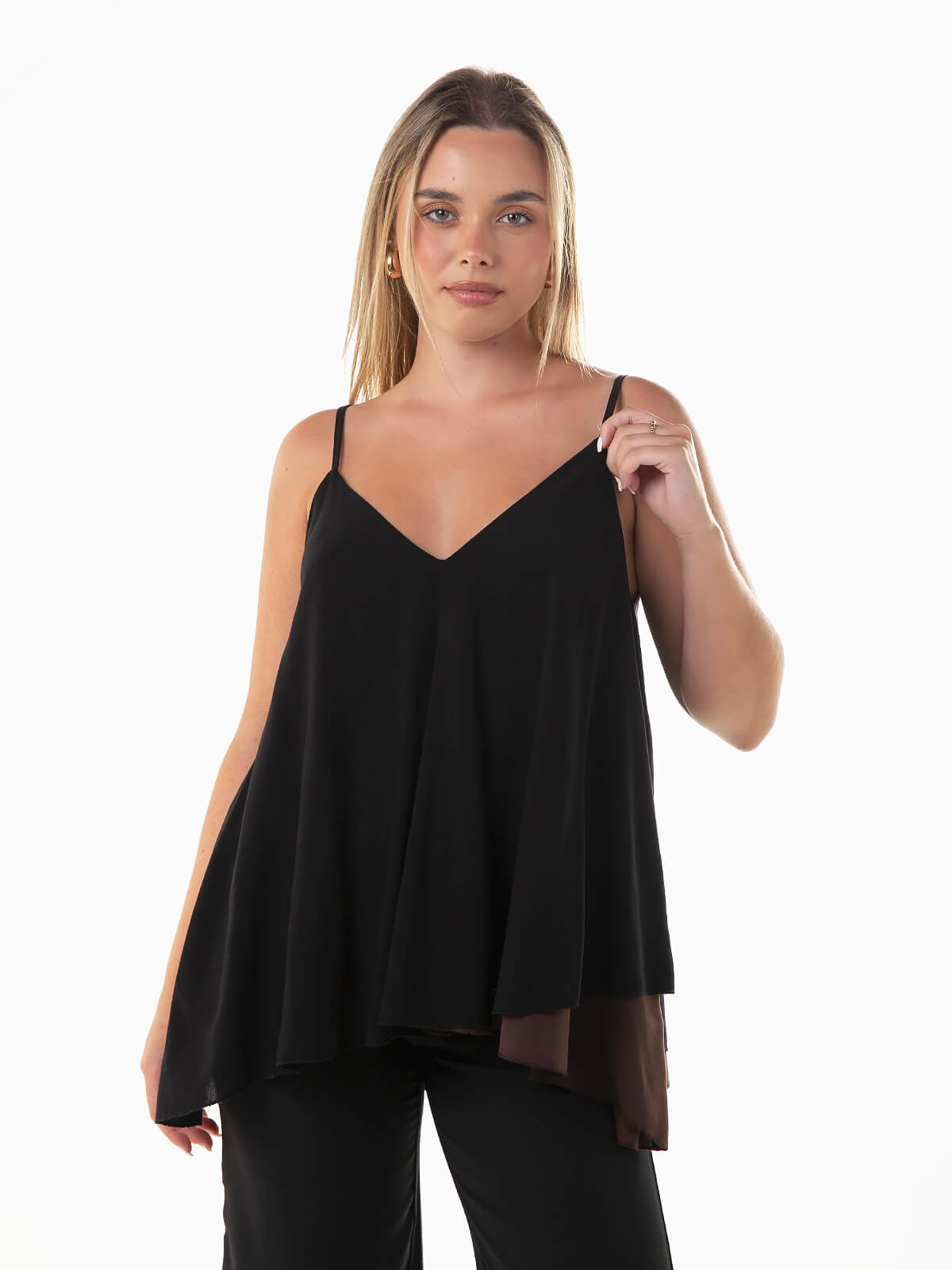 Top fluído com duplo tecido em contraste e corte assimétrico. Top alças para senhora com decote em V à frente e atrás.