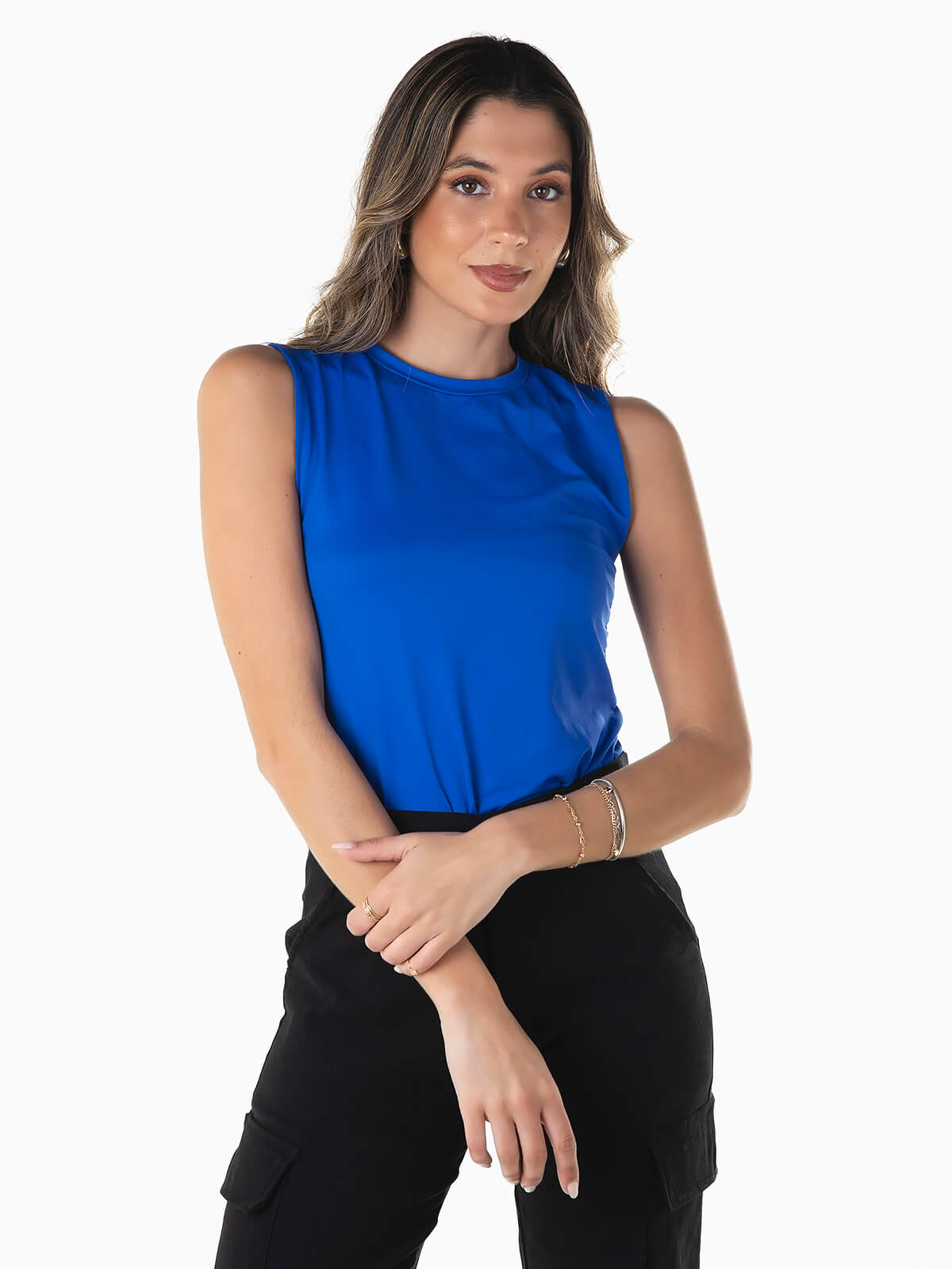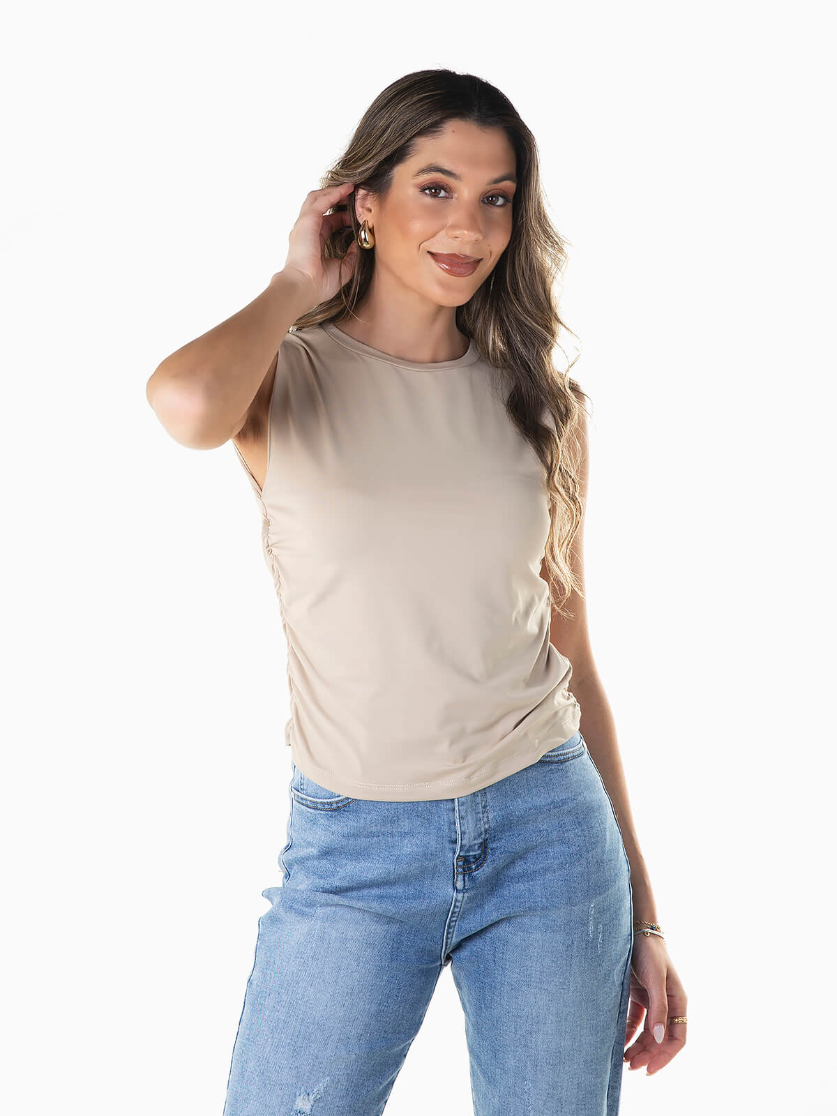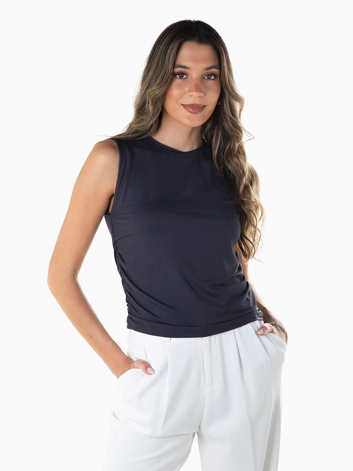 Top de manga cava com pormenor franzido nas laterais. Top elástico em tecido mistura poliamida para maior conforto. Decote redondo.
