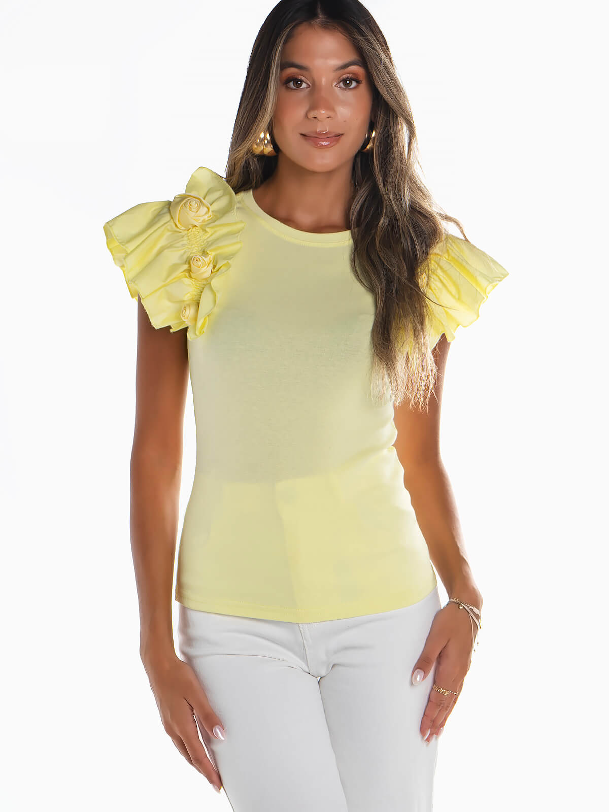 Top justo em malha com aplicações de folhos e flores nos ombros. Top manga cava com decote redondo.