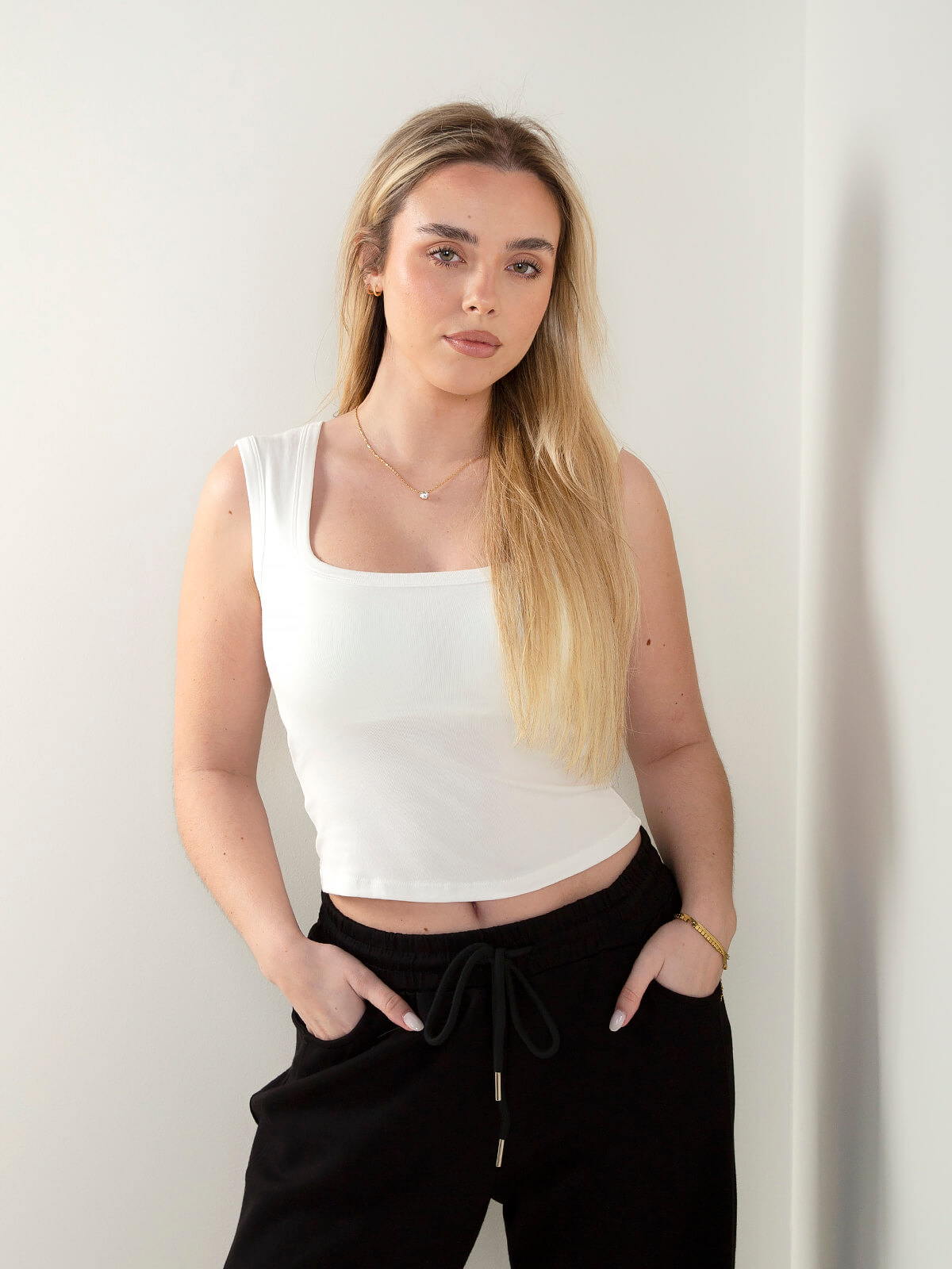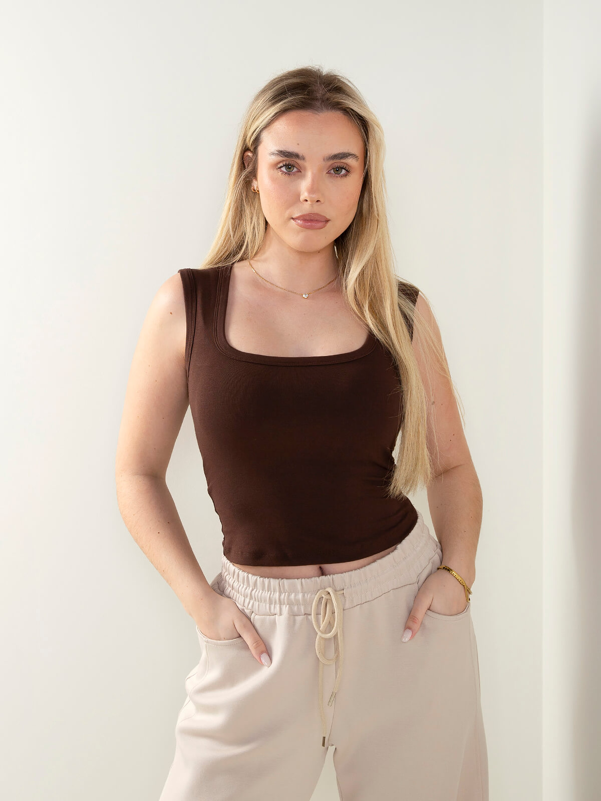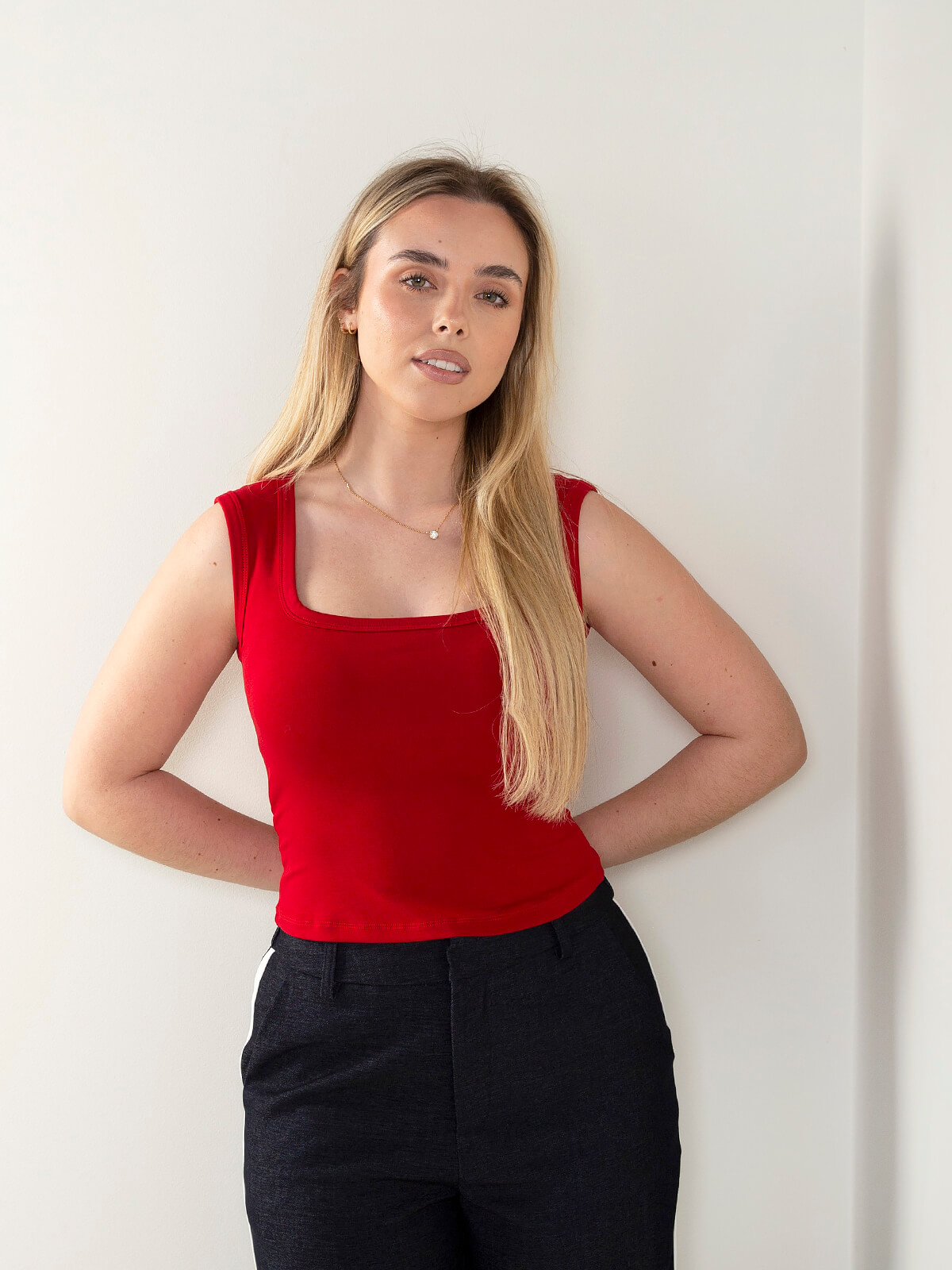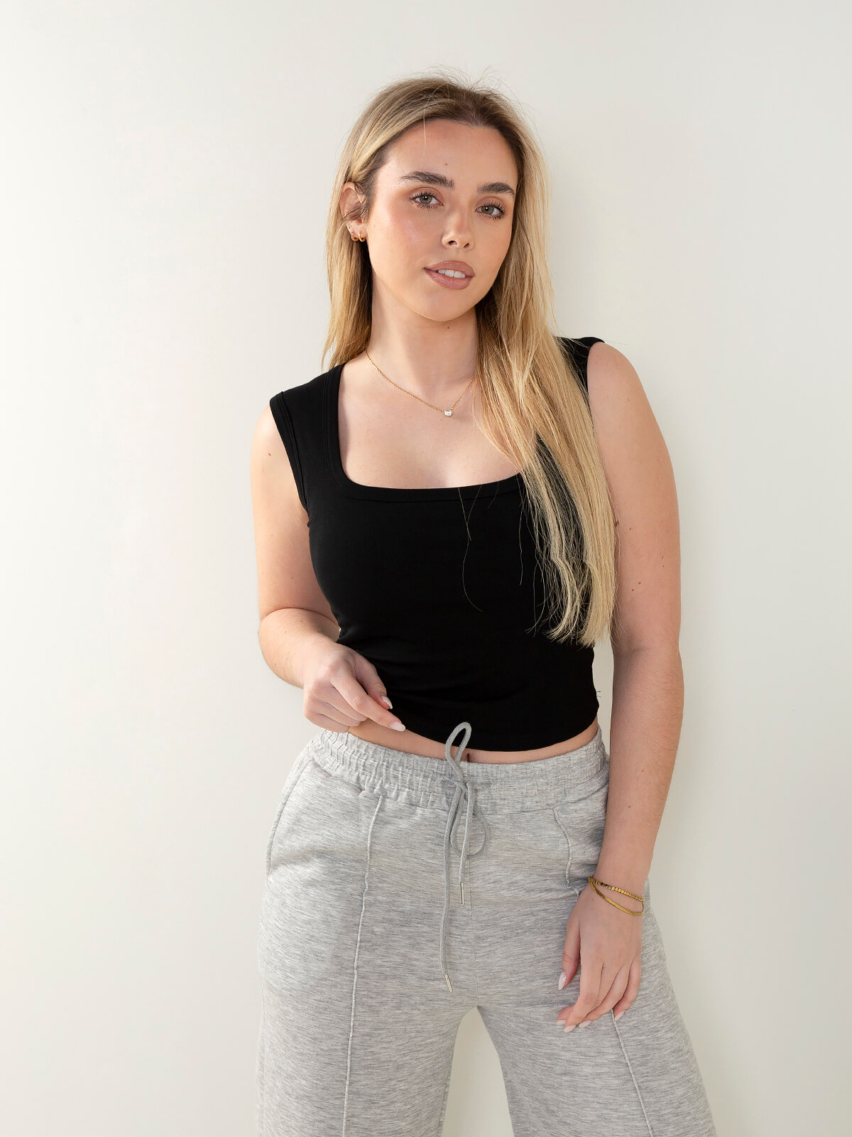 Top justo em malha elástica com decote quadrado e peito almofadado integrado. Modelo confortável que garante maior sustentação e segurança no dia a dia.