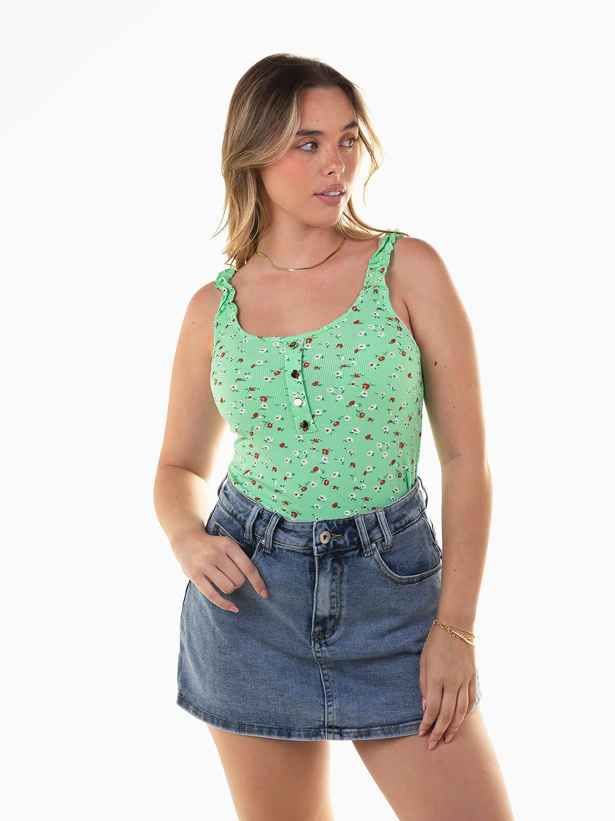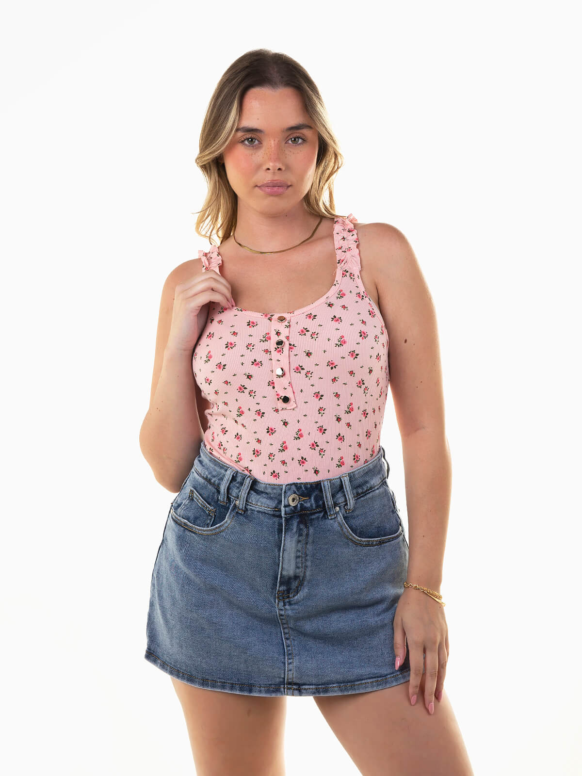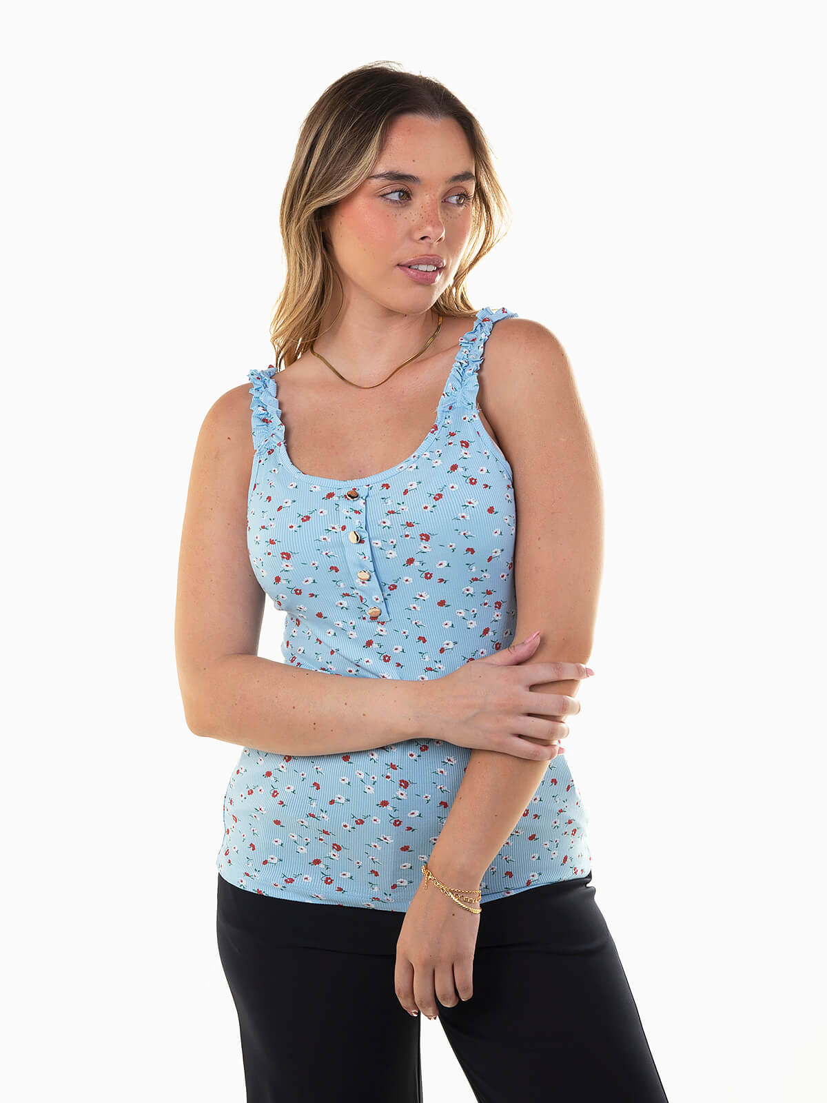 Top de alças com folhos, em malha canelada leve e elástica. Modelo justo ao corpo com estampado floral e botões decorativos à frente. Um essencial de verão com um toque romântico, perfeito para combinar com calças de cintura alta, calções ou saias fluídas.